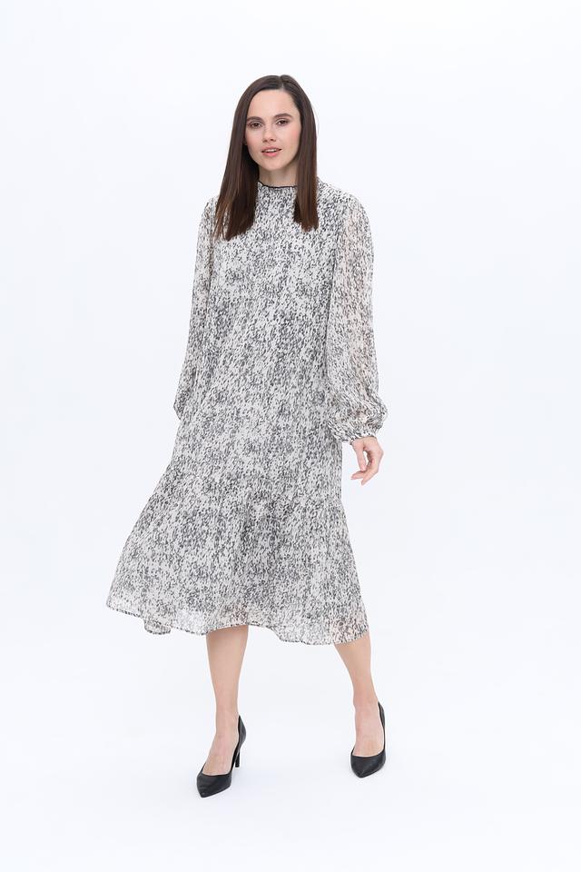 Платье имеет прямой, слегка расклешенный силуэт, который подходит для разных типов фигур. Вырез горловины – округлый, дополнен сборкой и небольшим воротничком-стойкой. Рукава длинные, объёмные, с манжетами, собранными в небольшую сборку у запястья.