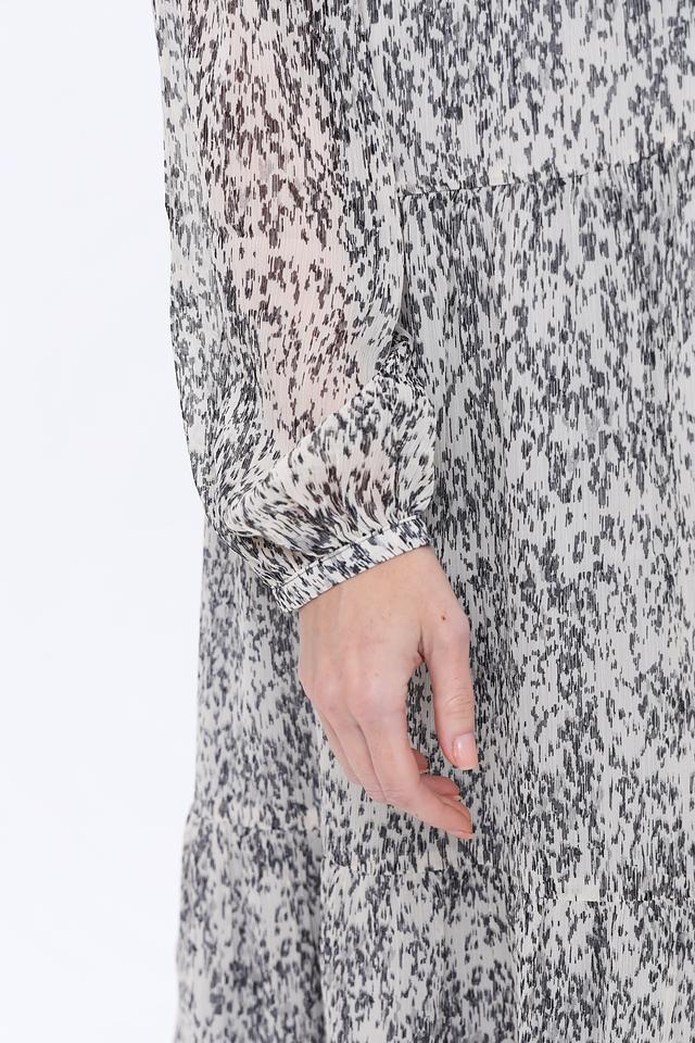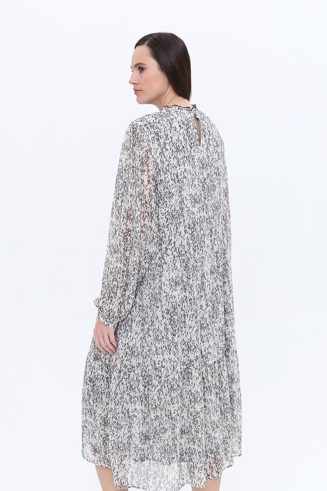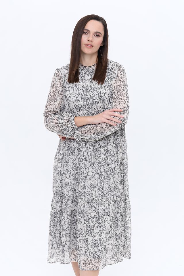 Это платье от Taifun выполнено из 100% полиэстера, что обеспечивает легкость и простоту в уходе. Преобладающий цвет – белый, украшенный мелким графичным принтом в чёрно-серых тонах.
