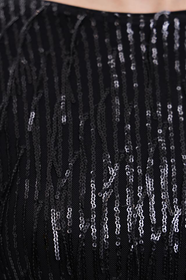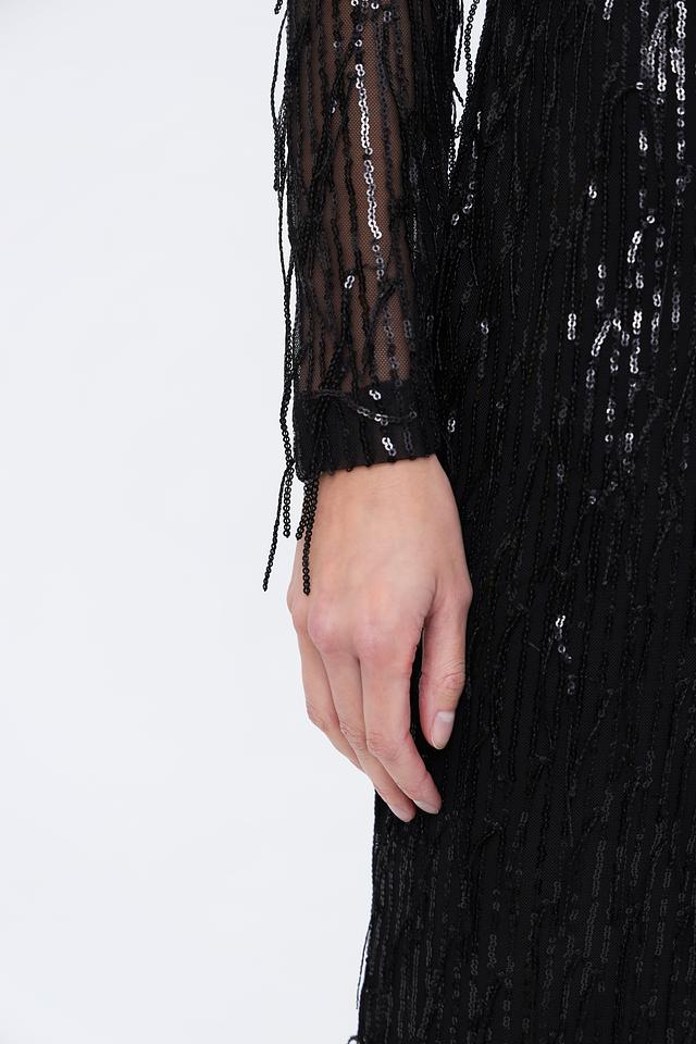Основным декоративным элементом является бахрома, которая покрывает всю поверхность платья, создавая эффектный и динамичный образ. Рукава платья длинные, также украшены бахромой. Вырез горловины округлый.
