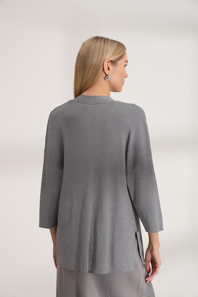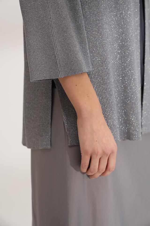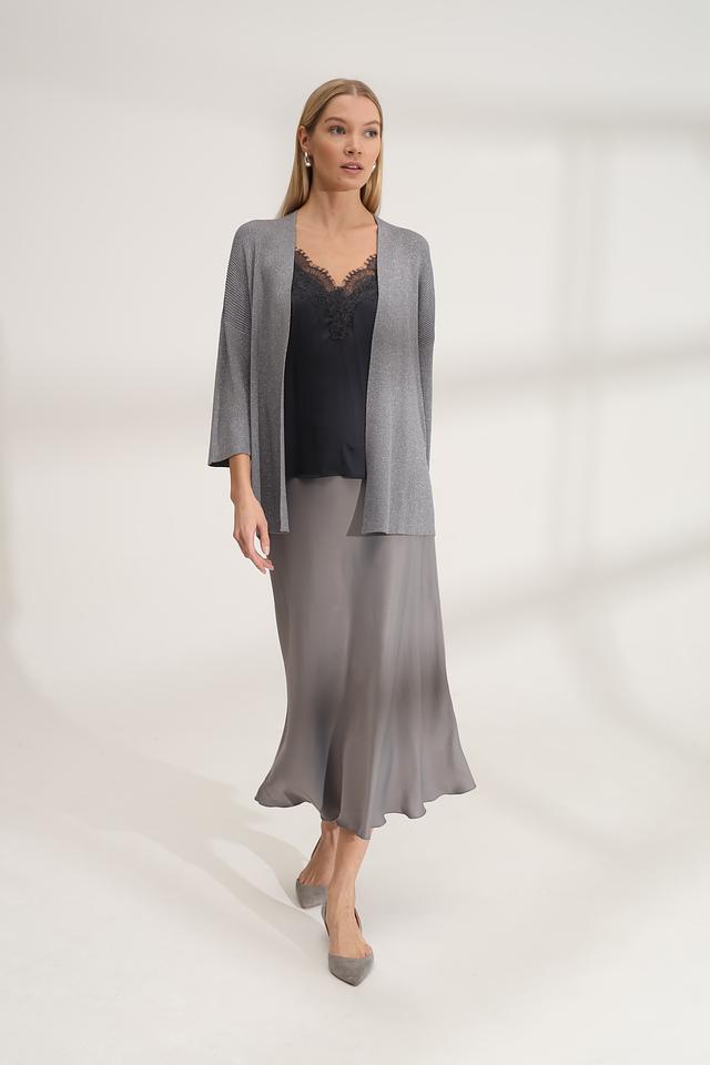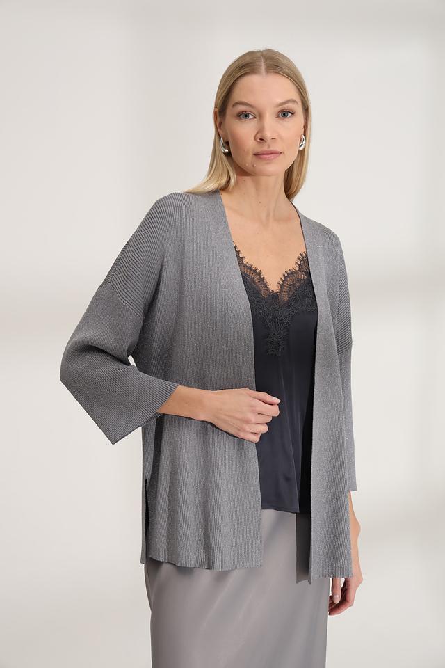 Жакет имеет открытый силуэт без застежек, что позволяет легко сочетать его с различными нарядами. Рукава 3/4 делают его универсальным для любого времени года. Текстура ткани с металлизированной нитью добавляет образу особый шарм и элегантность.