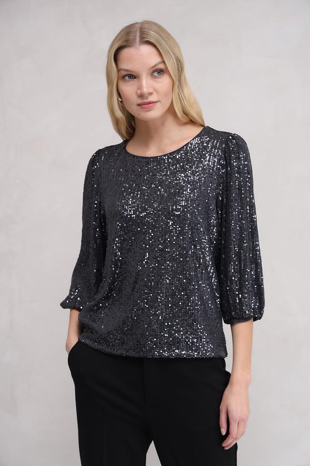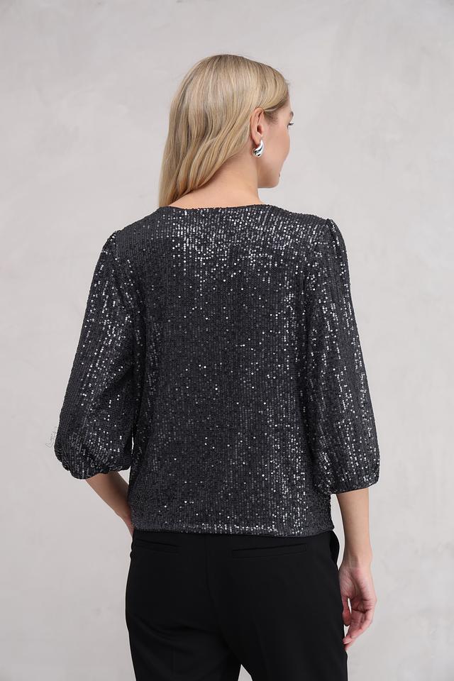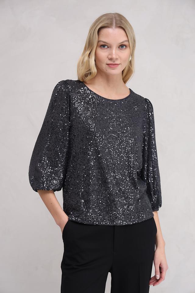 Блуза полностью покрыта мерцающими пайетками, которые создают эффектный блеск и привлекают внимание. Округлый вырез горловины и рукава длиной 3/4 придают модели элегантность и женственность. Свободный крой обеспечивает свободу движений и позволяет создать расслабленный, но при этом изысканный силуэт.
