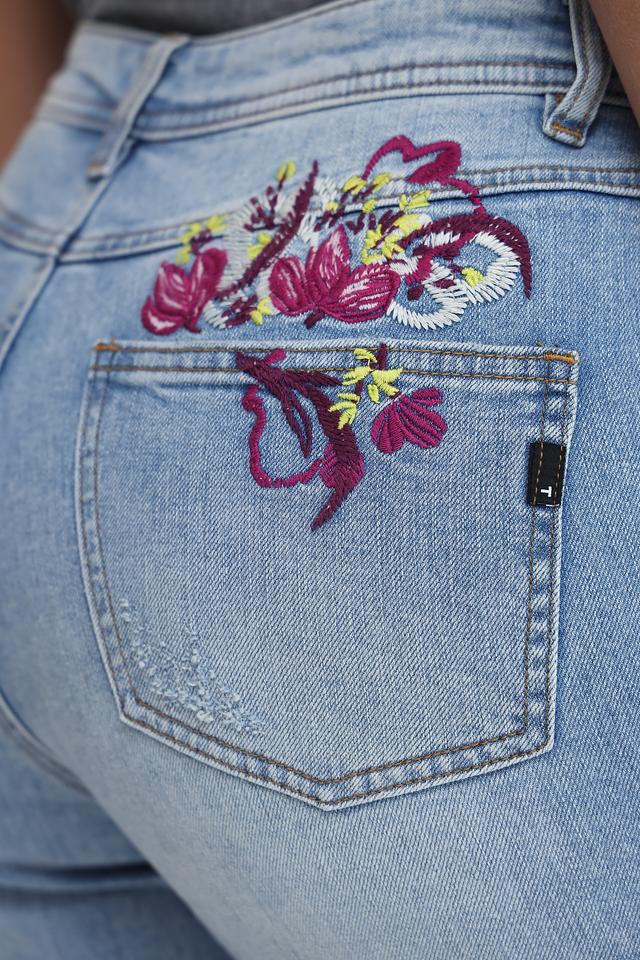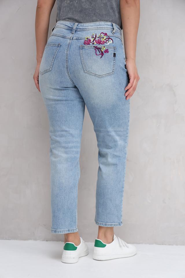Особенностью модели является вышивка в виде ярких цветов на заднем кармане, которая добавляет оригинальности и женственности. Джинсы имеют классический прямой крой и высокую посадку, подчеркивающую талию.