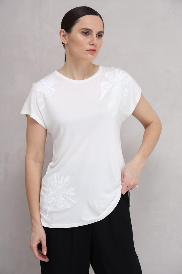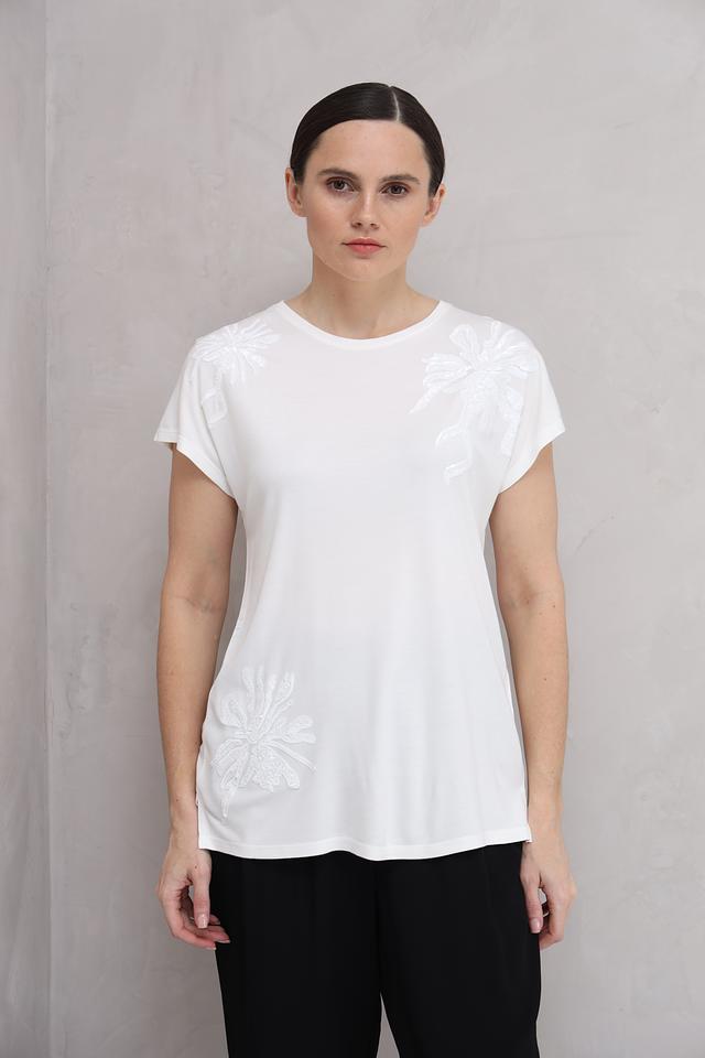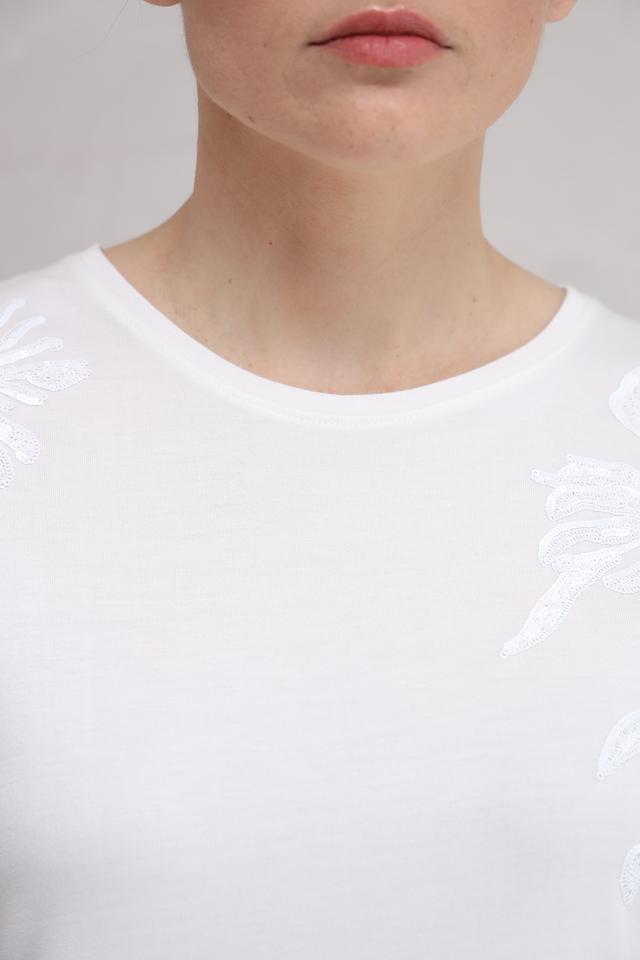 Белый цвет футболки делает ее универсальной и легко сочетаемой с другими вещами. Вышивка в виде цветочного орнамента придает ей особый шарм и изысканность.