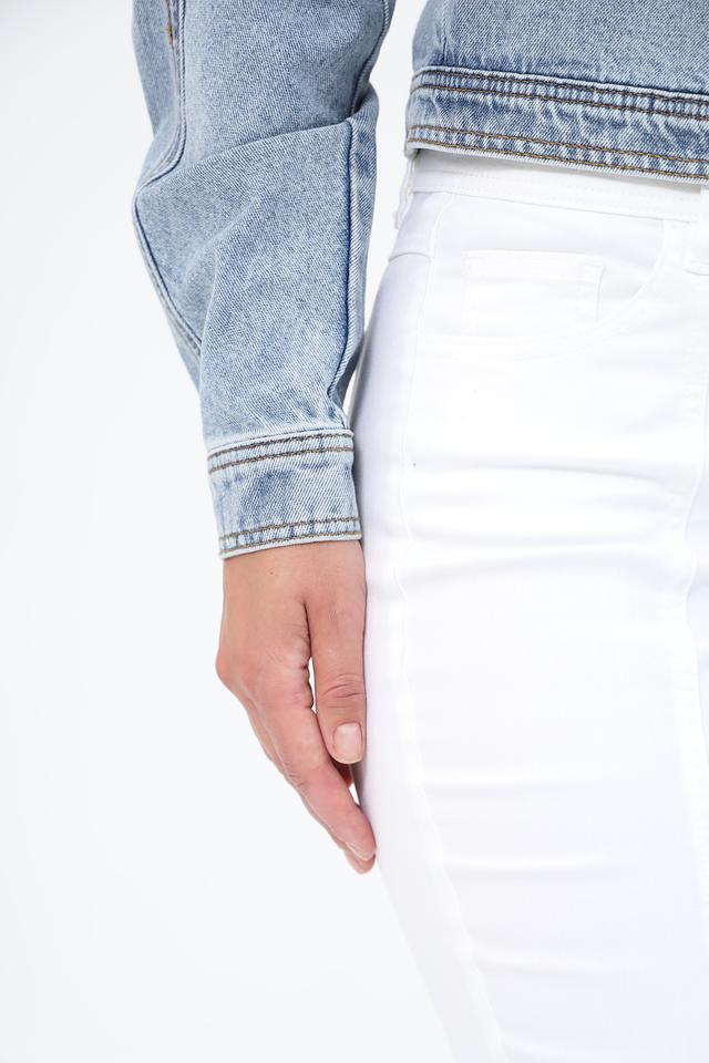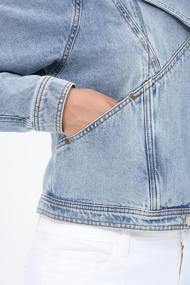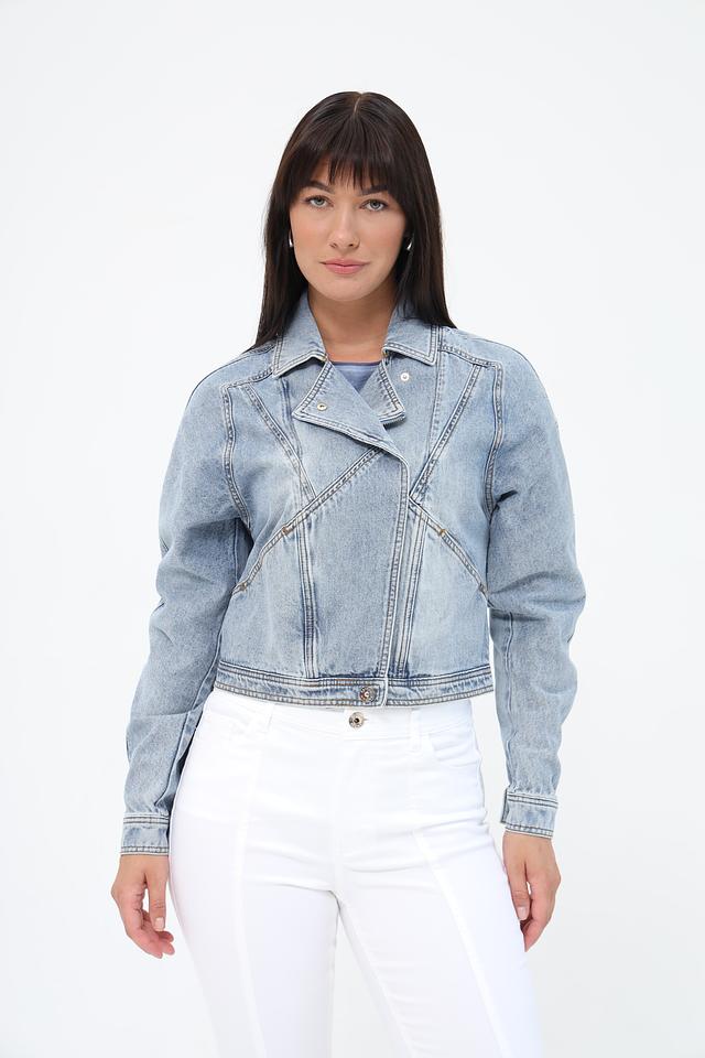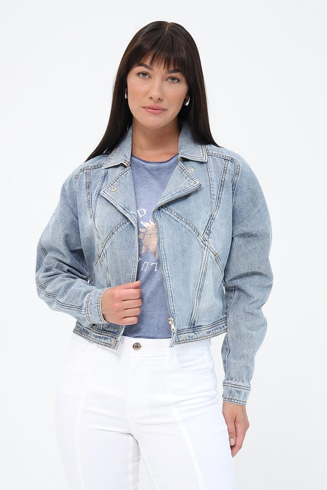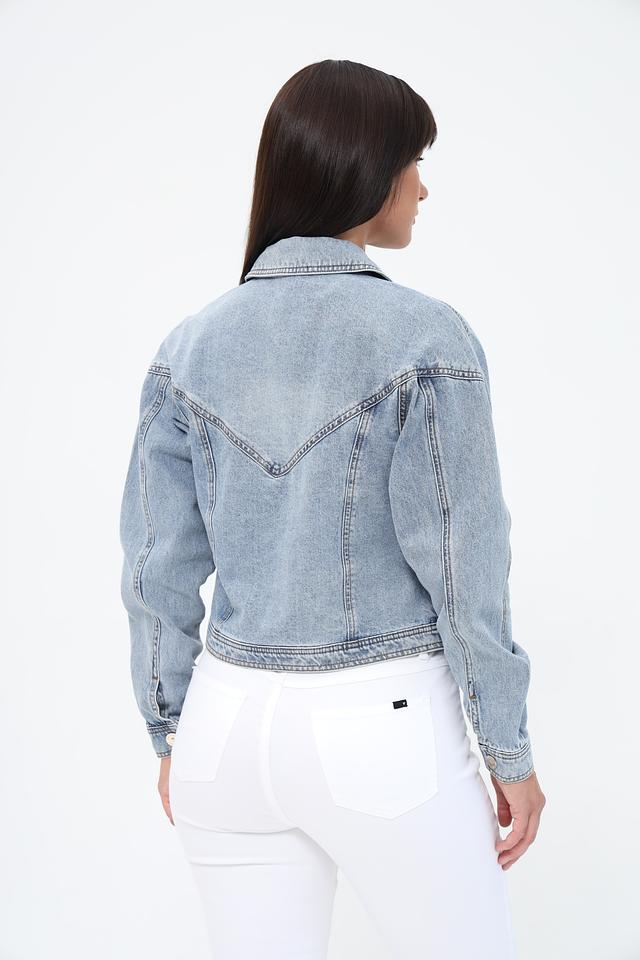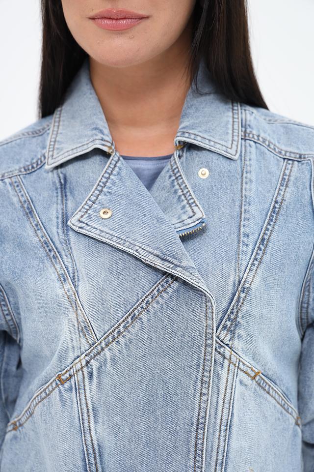 Жакет имеет светло-голубой цвет и эффект потертости, что придает ему винтажный вид. Укороченный крой и объёмные рукава создают современный и стильный силуэт. Застежка на молнию и пуговицы обеспечивает надежную фиксацию.