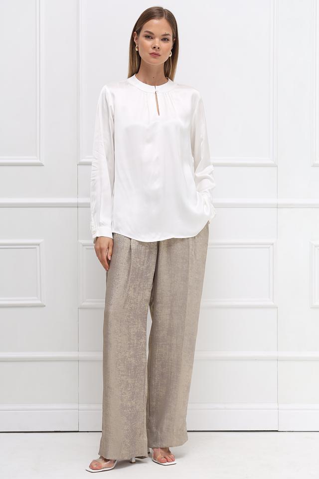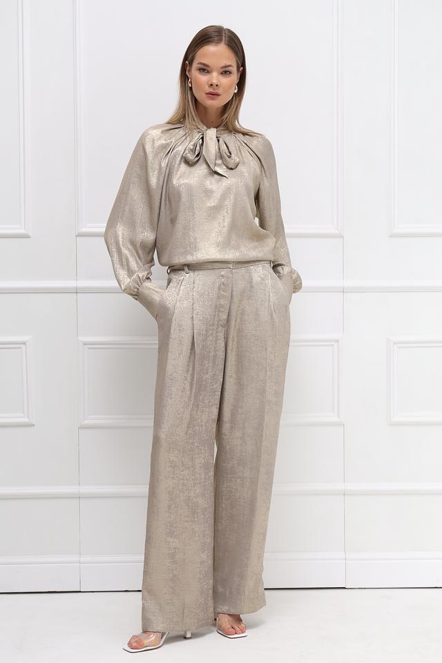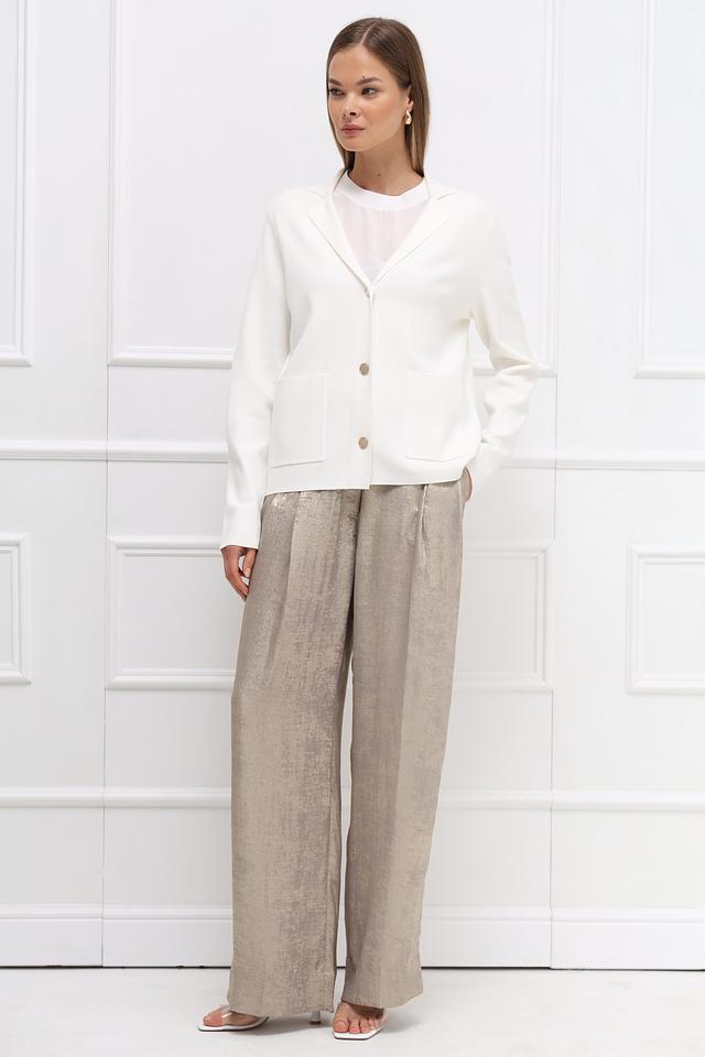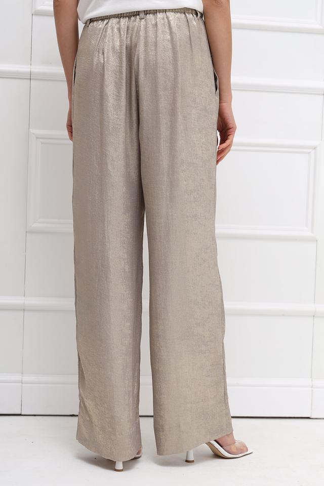 Брюки имеют прямой крой и широкие брючины, обеспечивающие свободу движений и комфорт в носке. Высокая посадка подчеркивает талию и создает элегантный силуэт. На брюках предусмотрены боковые карманы.