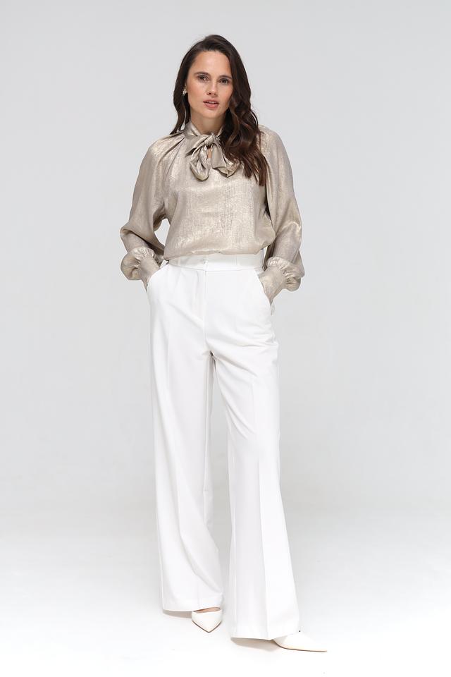 Блуза имеет длинные рукава и свободный крой, обеспечивающий комфорт при носке. Особый акцент сделан на декоративный бант на горловине, который добавляет образу романтичности.