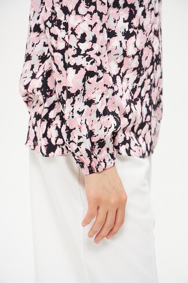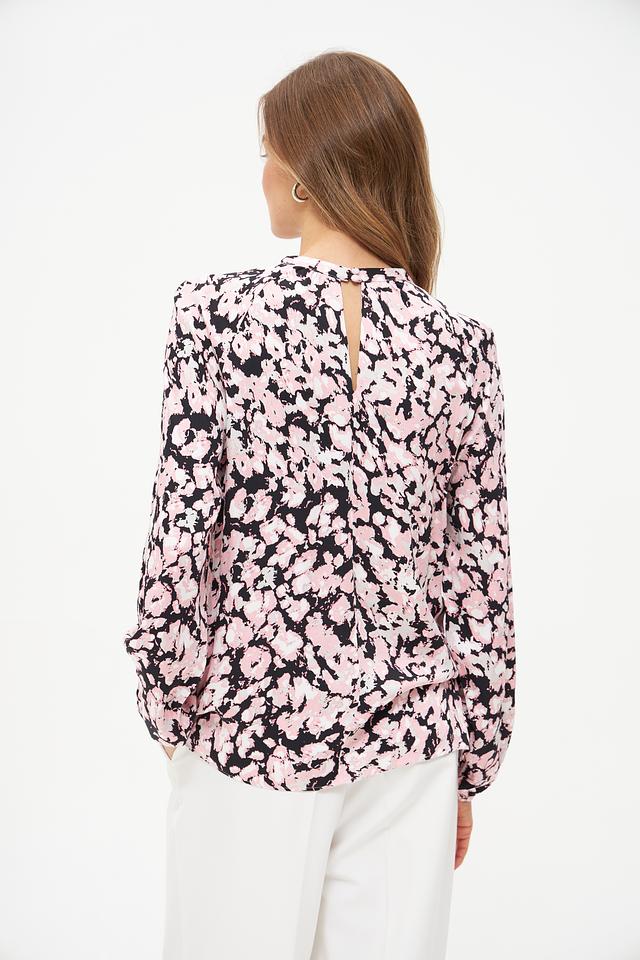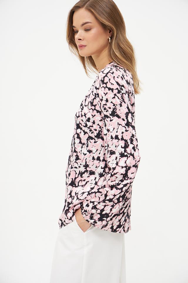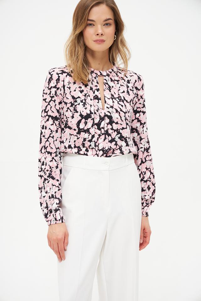 Блуза имеет нежно-розовый цвет с изысканным цветочным принтом, который придает ей романтичный и женственный вид. Вырез горловины дополнен небольшим разрезом, что добавляет образу легкости и оригинальности.