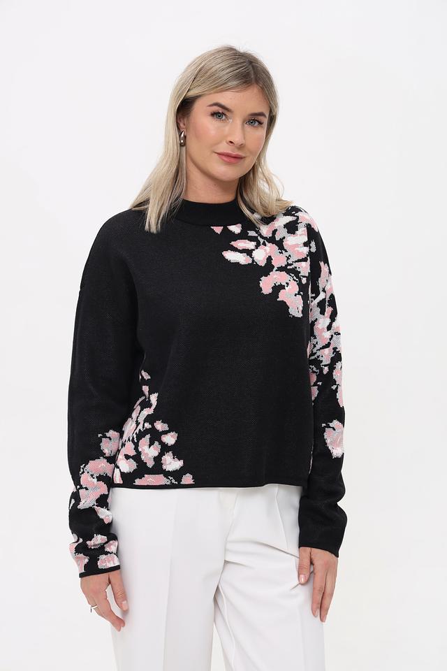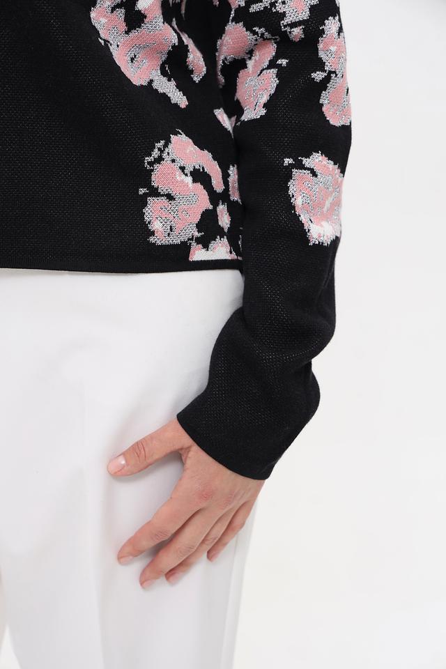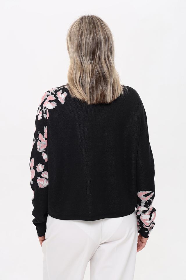 Модель имеет удобный крой и круглый вырез горловины. Рукава и нижняя часть пуловера оформлены узором с цветочным принтом, что делает его более интересным и оригинальным.