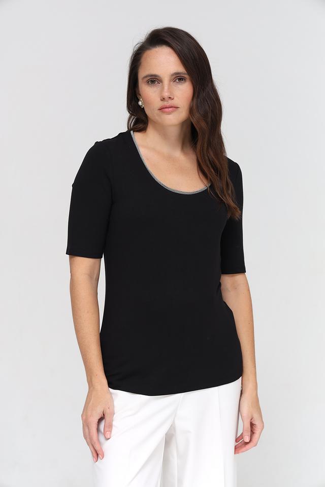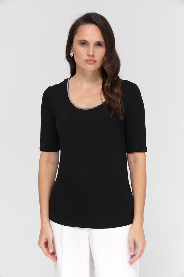 Чёрная футболка Taifun с короткими рукавами и округлым вырезом горловины, декорированная серой окантовкой. Изготовлена из мягкой и приятной к телу вискозы с добавлением эластана для комфортной посадки. Состав: вискоза 95%, эластан 5%