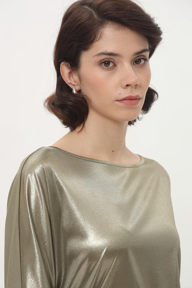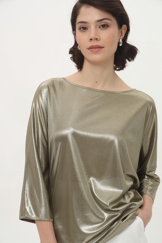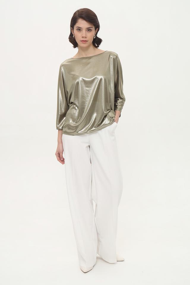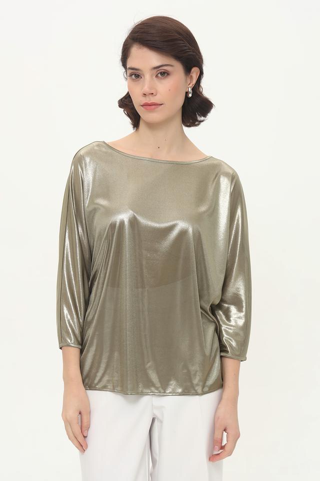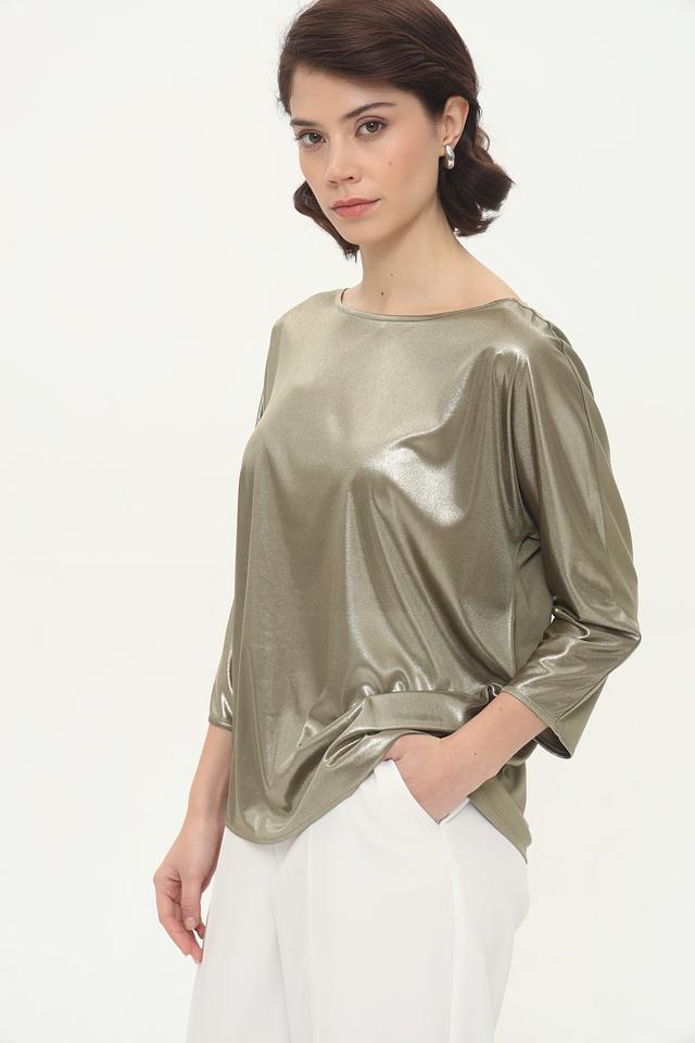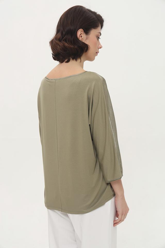 Модель отличается свободным кроем и рукавом три четверти, что делает ее универсальной для различных типов фигур. Округлый вырез горловины подчеркивает женственность образа. Блуза идеально сочетается с брюками, юбками и джинсами, позволяя создавать разнообразные стильные комплекты.