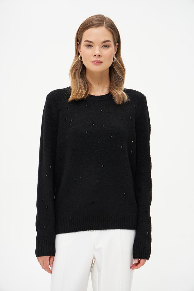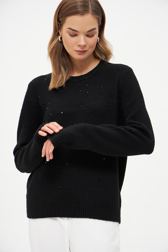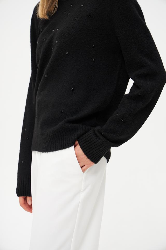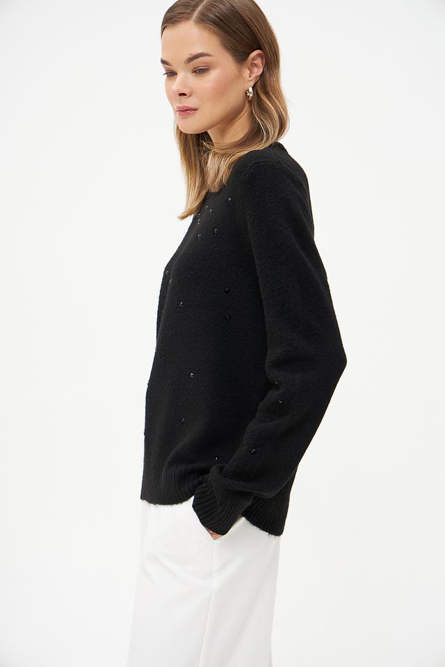 Пуловер имеет классический крой с круглым вырезом горловины и длинными рукавами. Особый шарм изделию придаёт декор в виде небольших бусин, аккуратно расположенных по всей поверхности. Бусины добавляют текстуру и делают этот пуловер более интересным и привлекательным.