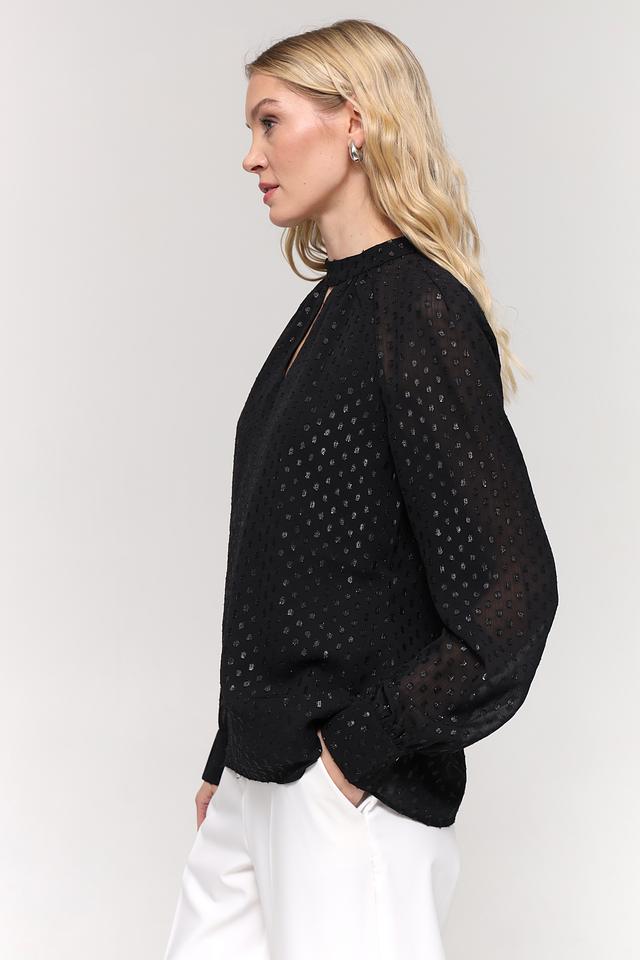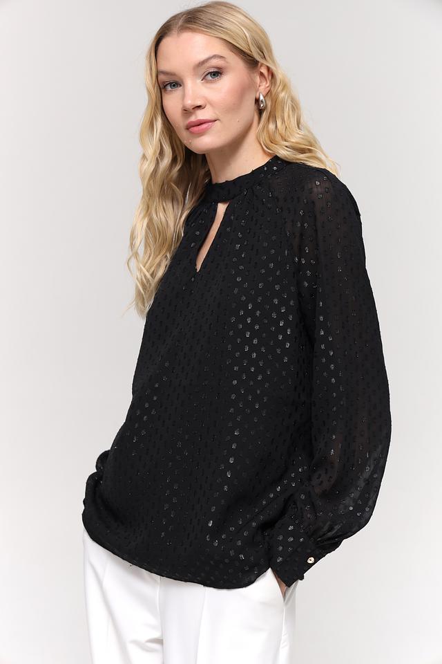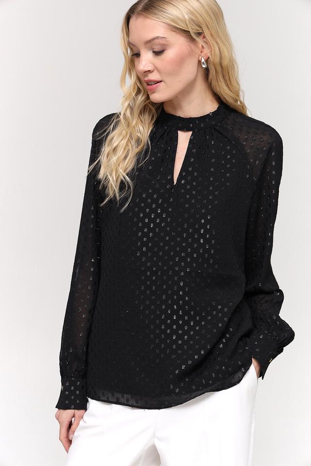 Чёрный цвет блузы украшен мерцающими золотистыми пайетками, которые придают ей праздничный и привлекательный вид. Вырез горловины в форме капли добавляет образу женственности и оригинальности. Длинные рукава с небольшими манжетами завершают стильный силуэт.