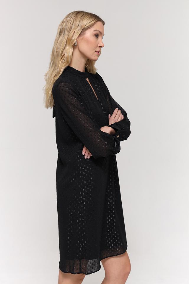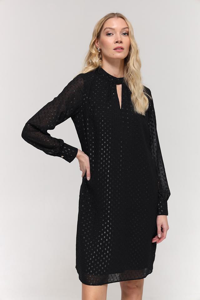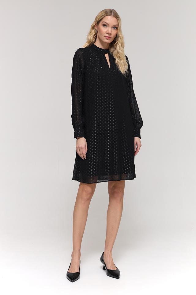 Чёрное платье от Taifun – это элегантная модель с длинными рукавами и небольшим вырезом на горловине. Платье выполнено из полиэстера с деликатным узором, что придает ему особый шарм и текстуру. Состав: полиэстер 100%