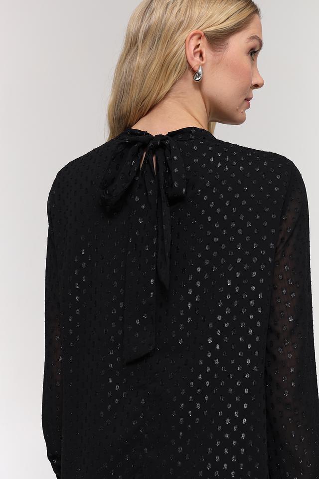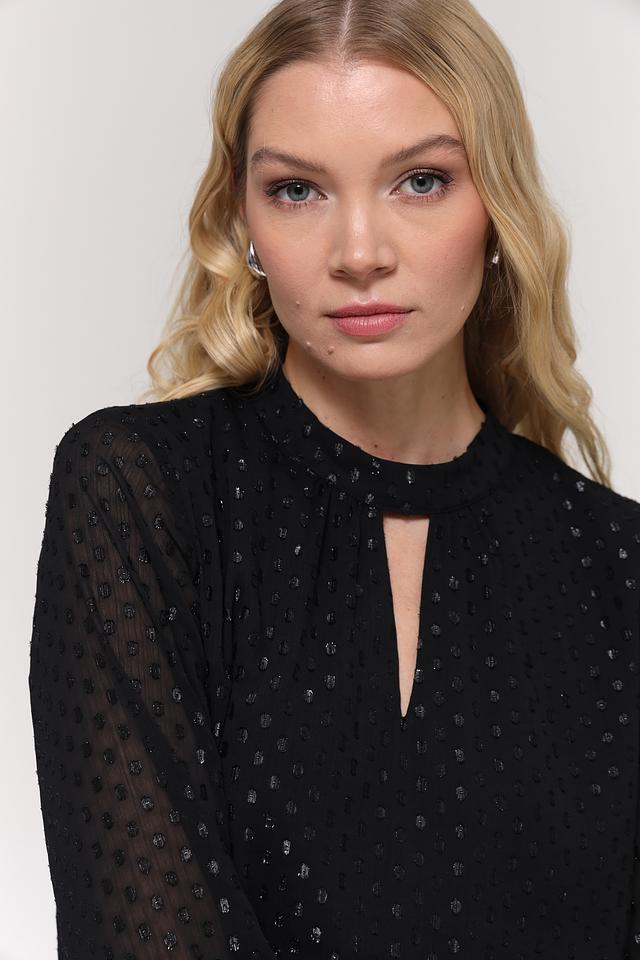 Модель имеет длинные рукава из полупрозрачной ткани, которые добавляют образу лёгкости и изящества. Вырез на горловине в форме небольшого отверстия придает платью оригинальность и привлекательность.