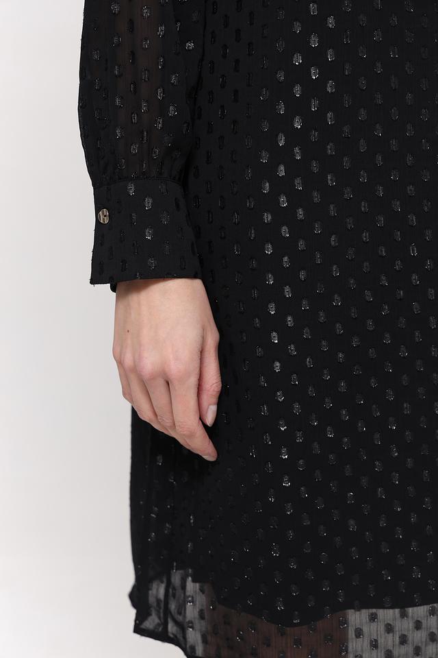 Платье изготовлено из 100% полиэстера, что обеспечивает комфорт в носке и простоту ухода. Ткань с деликатным узором создает эффектный визуальный интерес. Свободный крой платья позволяет чувствовать себя комфортно в течение всего дня.