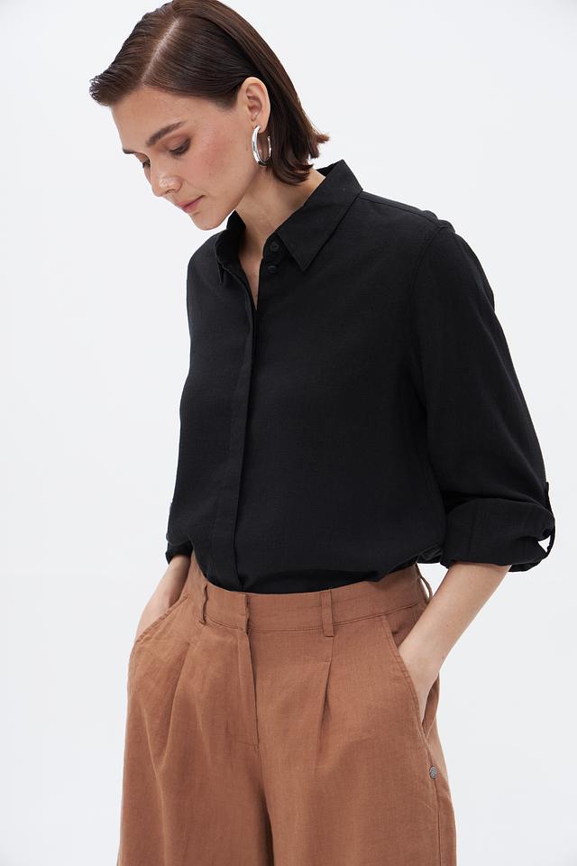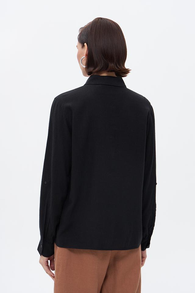 Блуза имеет прямой крой, который обеспечивает комфортную посадку по фигуре. Рукав 3/4 делает её подходящей для любого времени года. Воротник рубашечного типа добавляет образу строгости и деловитости.