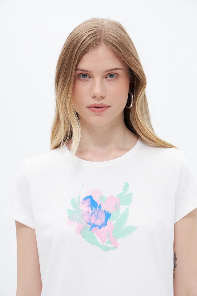 Модель имеет прямой крой и короткие рукава, что делает ее идеальной для теплой погоды. Главной особенностью футболки является яркий цветочный принт, который добавляет образу женственности и легкости.
