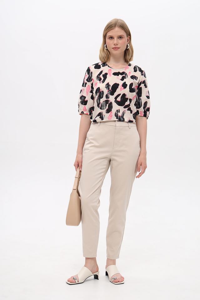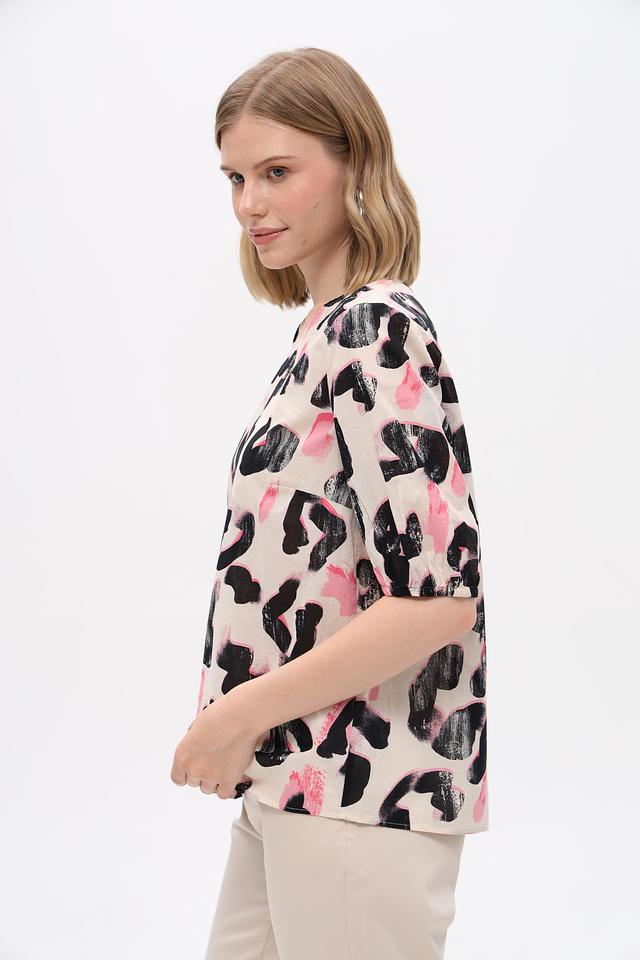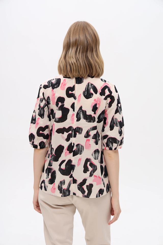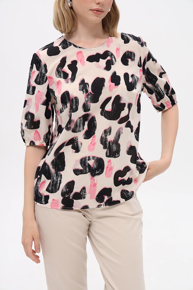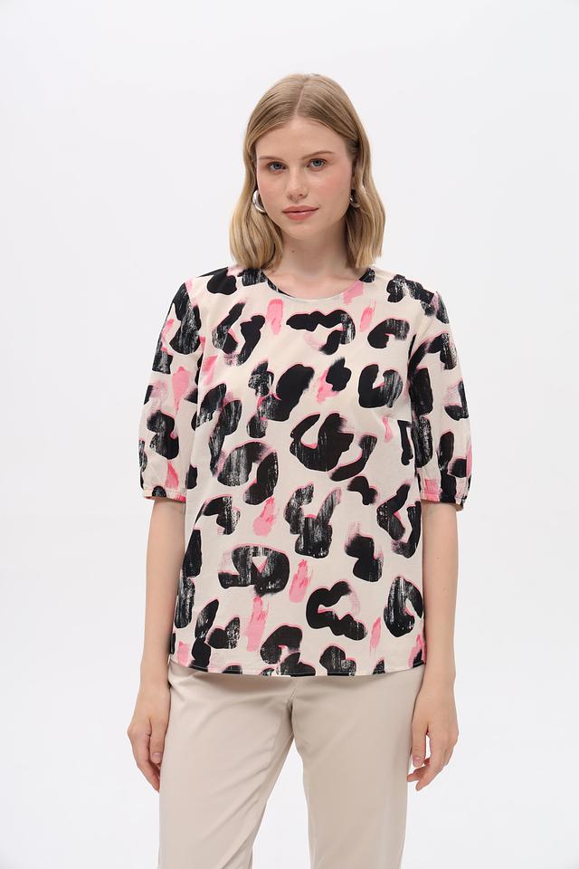 Модель имеет свободный крой и короткие рукава с небольшими складками у плеч, что придает ей лёгкость и воздушность. Круглый вырез горловины делает блузу универсальной и подходящей для различных типов фигуры.