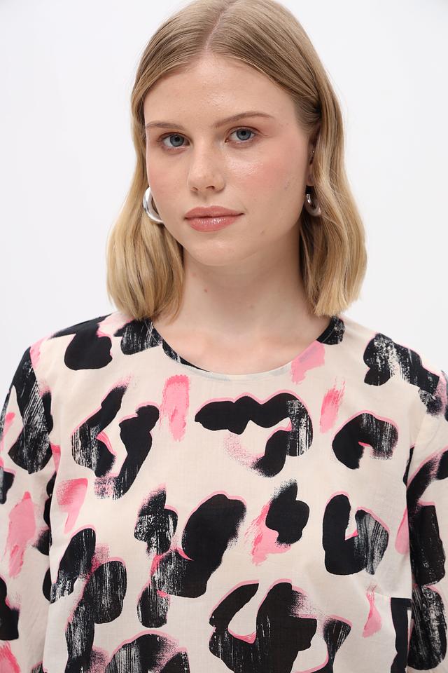 Эта блуза от Taifun – отличный выбор для создания яркого и запоминающегося образа. Блуза выполнена в бежевом цвете и украшена абстрактным принтом, сочетающим в себе чёрные и розовые оттенки.