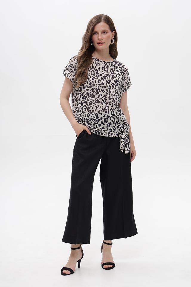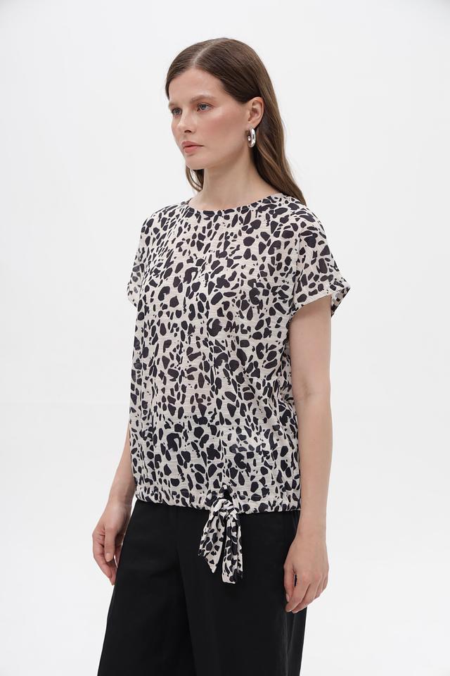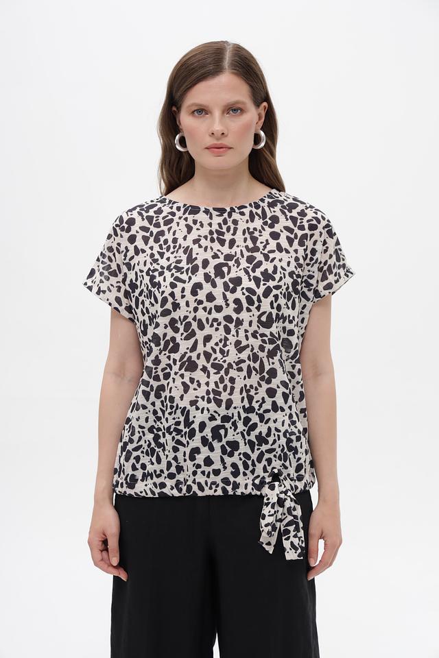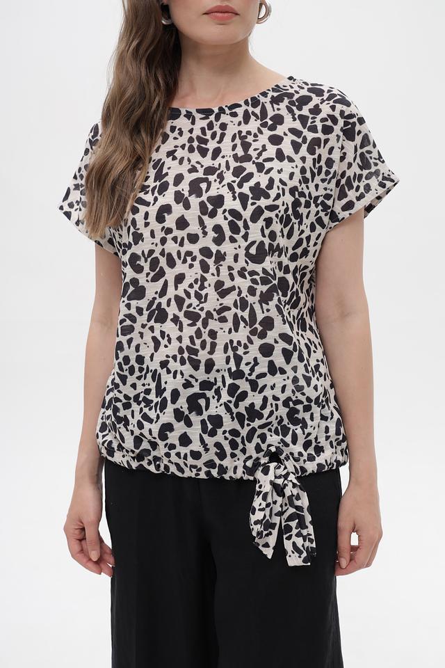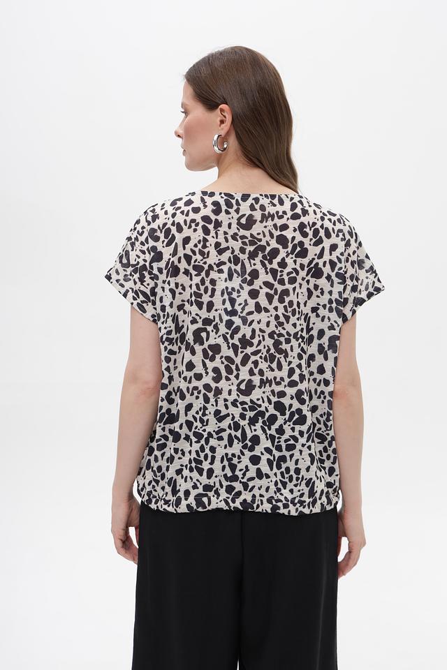 Блуза имеет свободный крой и короткие рукава, что обеспечивает комфорт в жаркую погоду. Оригинальный принт в чёрно-белой гамме добавляет образу динамичности и стиля.
