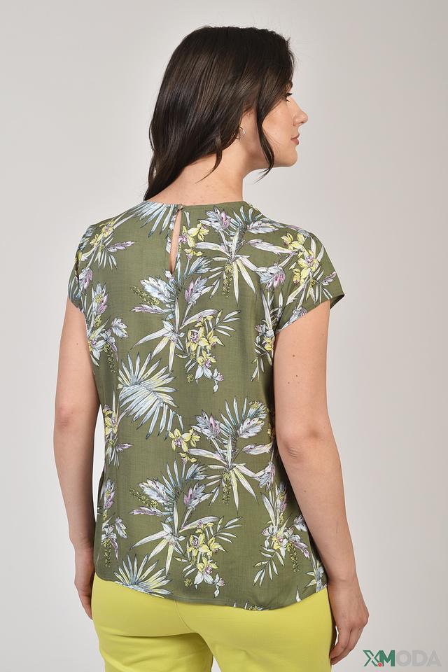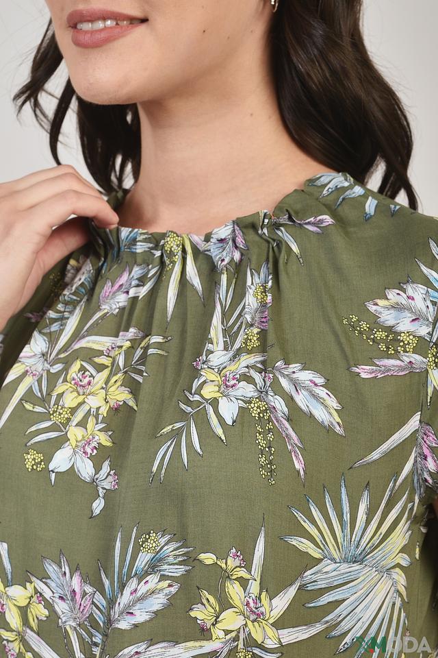 Основной цвет блузы – оливковый, а яркий принт с изображением тропических листьев и цветов придает ей неповторимый и освежающий вид.