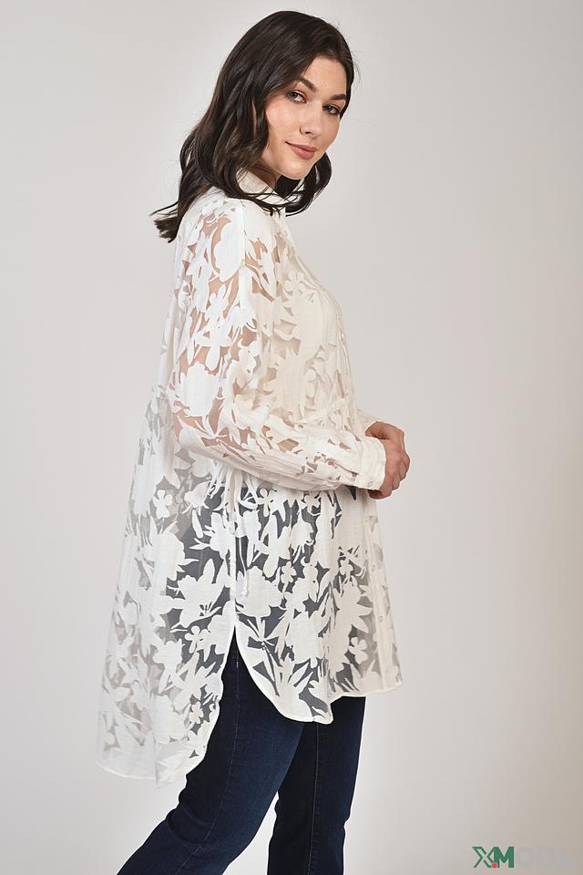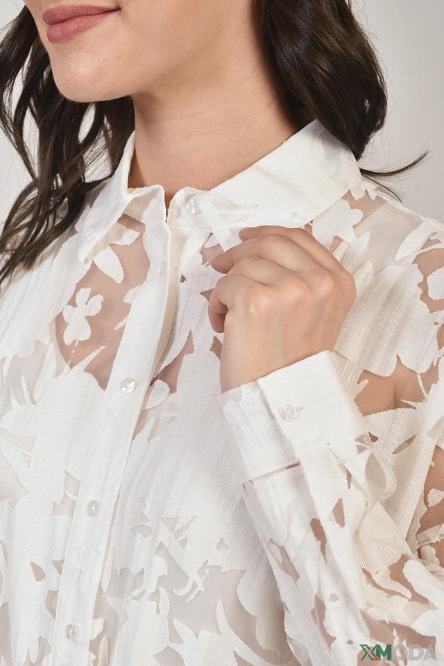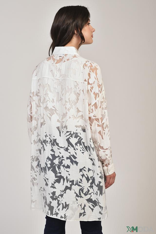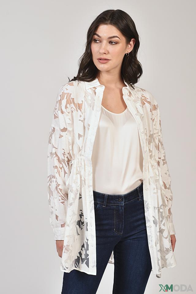 Блуза имеет свободный крой, что обеспечивает комфорт и свободу движений. Рукава блузы длинные, слегка расклешенные к низу. Застёжка выполнена на пуговицы по всей длине, что позволяет регулировать степень открытости.