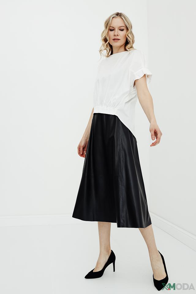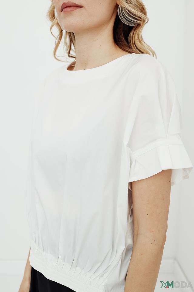 Блуза имеет свободный крой, который не сковывает движения и обеспечивает комфорт в течение всего дня. Короткие рукава с воланами придают образу женственность и лёгкость. Сборка по низу добавляет оригинальности и акцентирует внимание на талии.