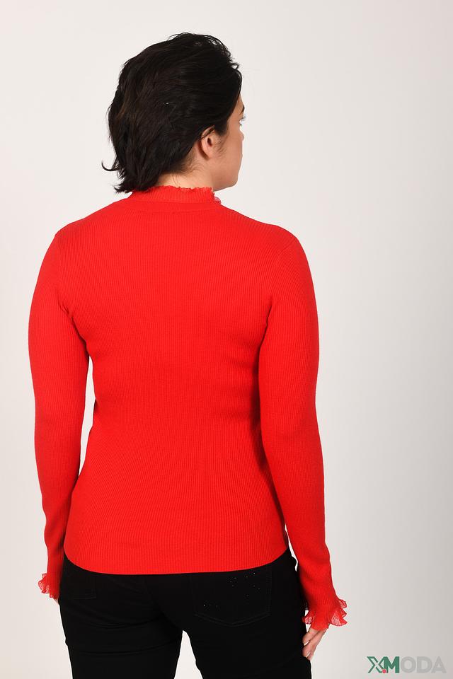 Яркий красный цвет пуловера делает его акцентным элементом гардероба. Он прекрасно сочетается с джинсами, брюками или юбками.