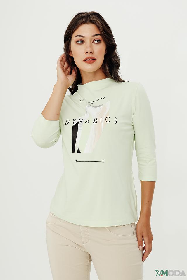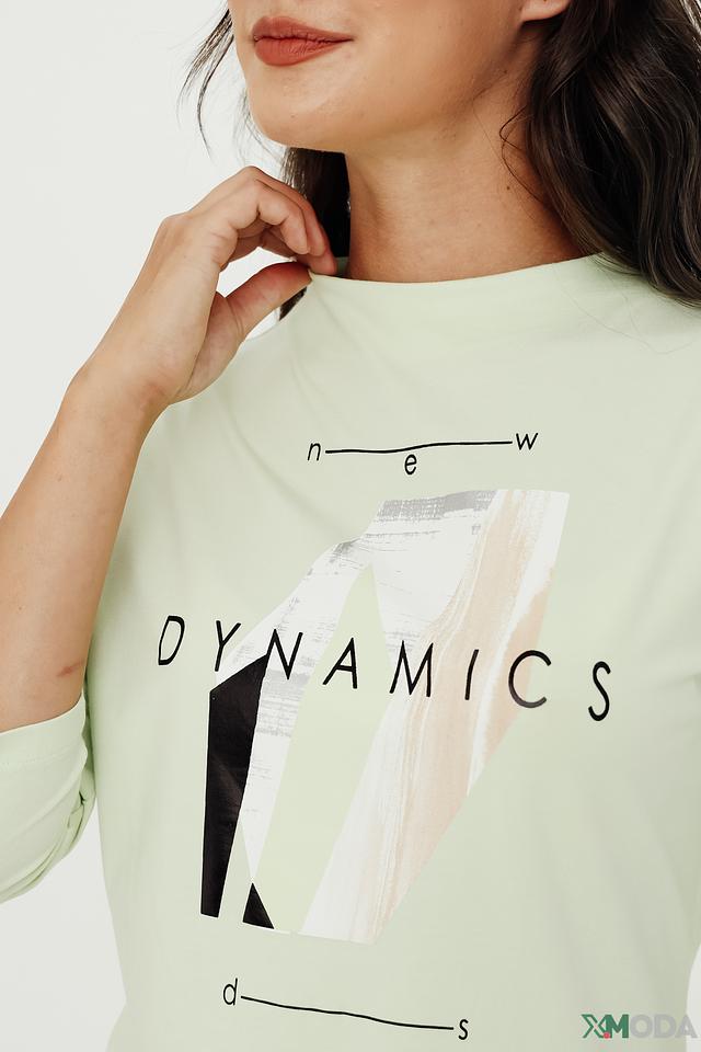 Джемпер имеет прямой крой, удобную круглую горловину и рукава длиной 3/4. Главной особенностью модели является яркий и запоминающийся принт с графическим изображением и надписью "DYNAMICS". Мятный цвет джемпера освежает образ и легко сочетается с другими элементами гардероба.