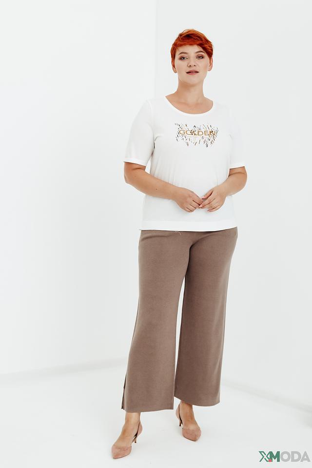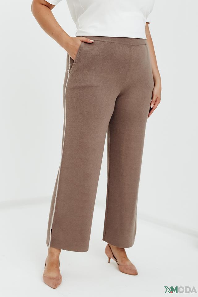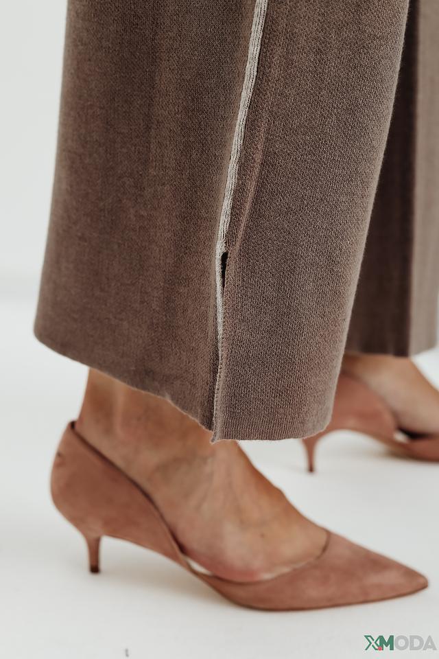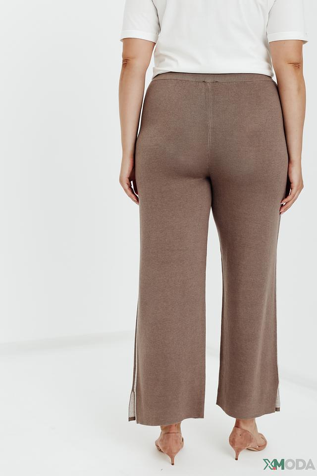 Брюки имеют свободный крой палаццо, который визуально удлиняет ноги и создает элегантный силуэт. Эластичный пояс обеспечивает комфортную посадку по фигуре, а боковые разрезы добавляют образу легкости и динамики.