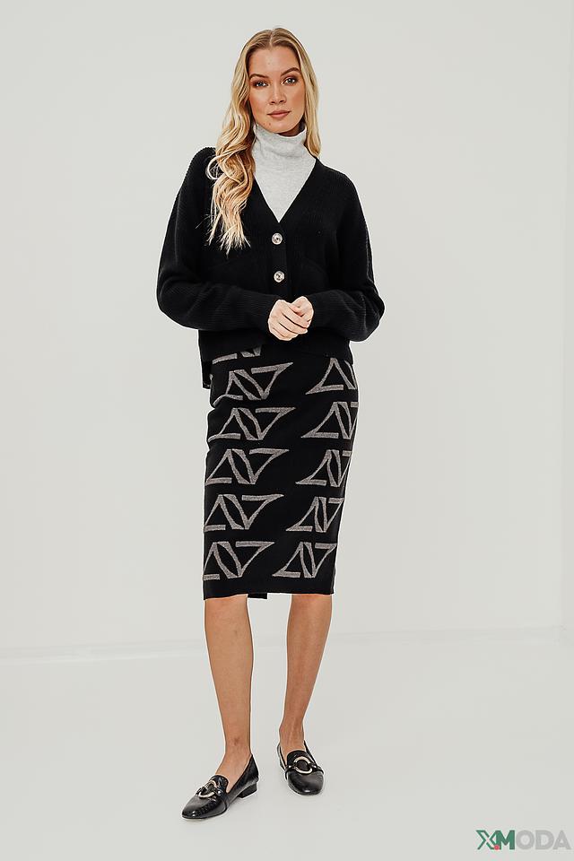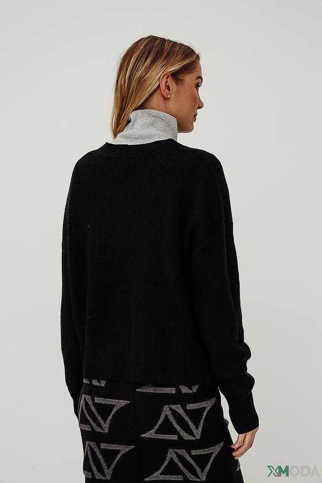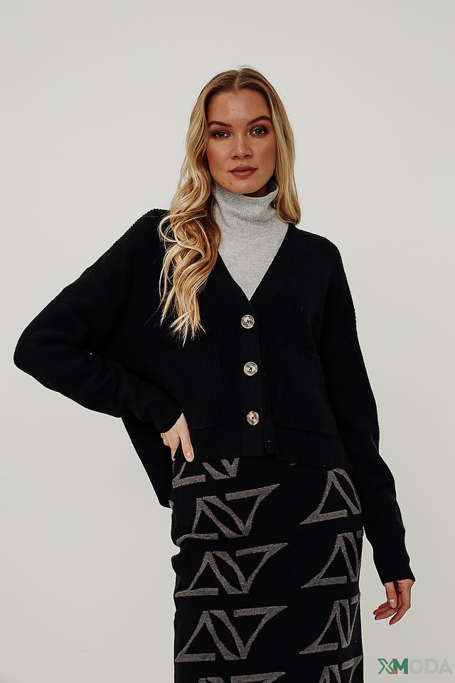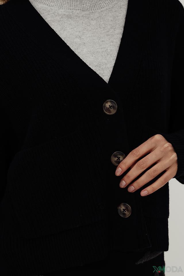 Модель имеет V-образный вырез и застегивается на три пуговицы. Прямой крой кардигана обеспечивает свободу движений, а умеренная длина делает его универсальным для сочетания с различными предметами одежды.