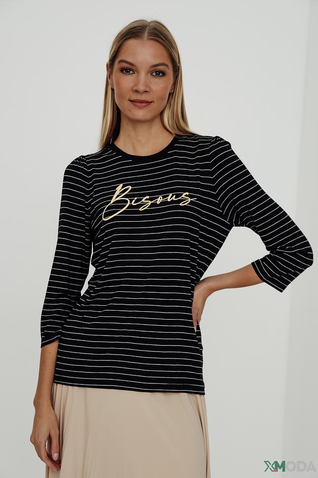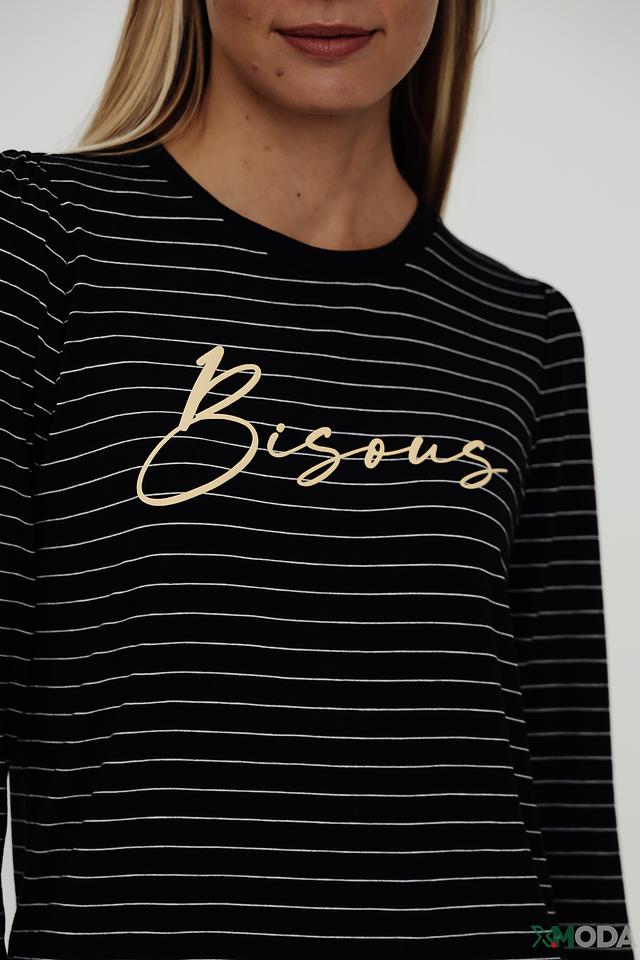 Этот джемпер от Taifun – идеальный выбор для создания повседневного образа. Он выполнен в классической полосатой расцветке, сочетающей чёрный и белый цвета. На передней части джемпера расположена надпись "Bisous", выполненная белым цветом, что добавляет ему оригинальности.