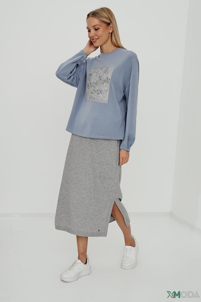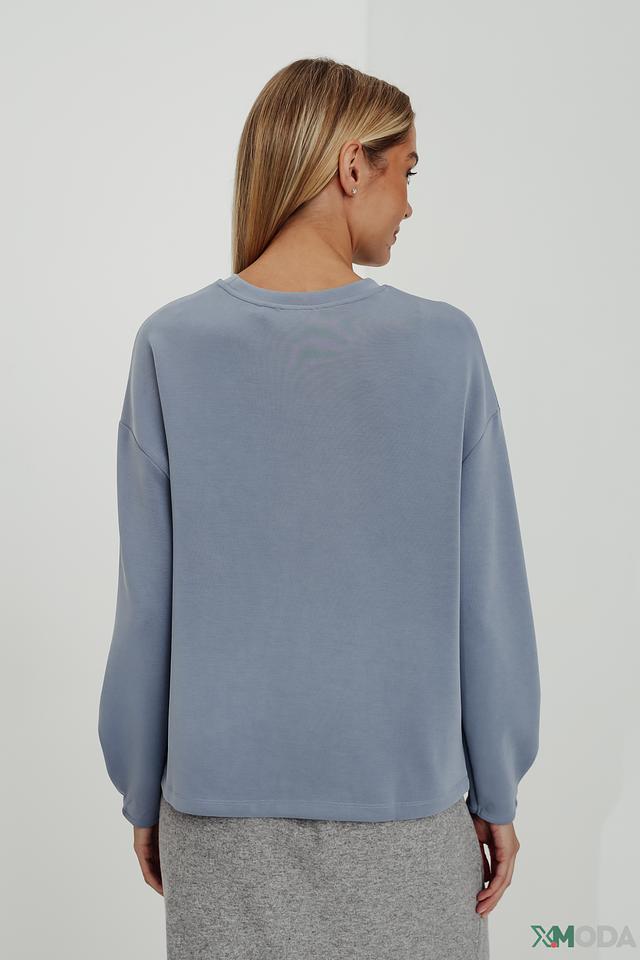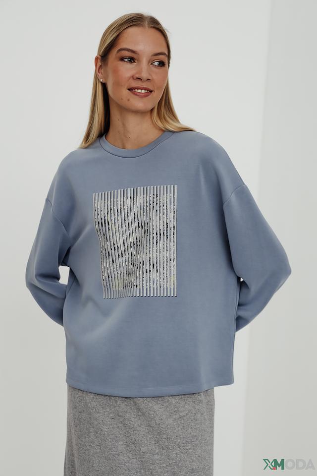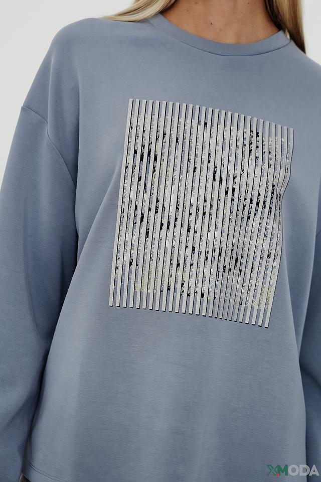 Особенностью данной модели является стильный принт на лицевой стороне, выполненный в серебристых тонах. Пуловер имеет круглый вырез горловины и длинные рукава с манжетами. Материал пуловера – сочетание модала, полиэстера и эластана, что обеспечивает мягкость, приятные тактильные ощущения и хорошую посадку по фигуре.