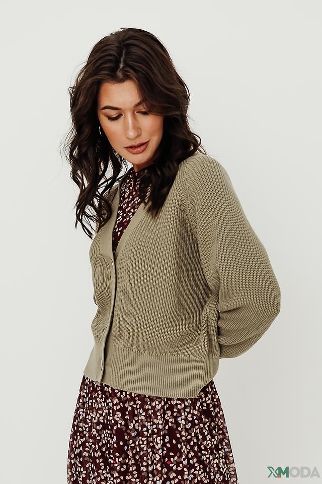 Кардиган имеет классический V-образный вырез и застегивается на ряд пуговиц. Особенности кроя включают слегка спущенные рукава и свободный силуэт, что делает его универсальным для различных типов фигур.
