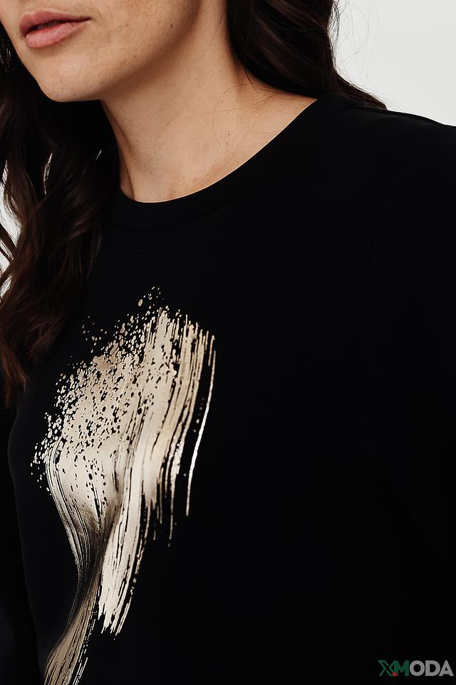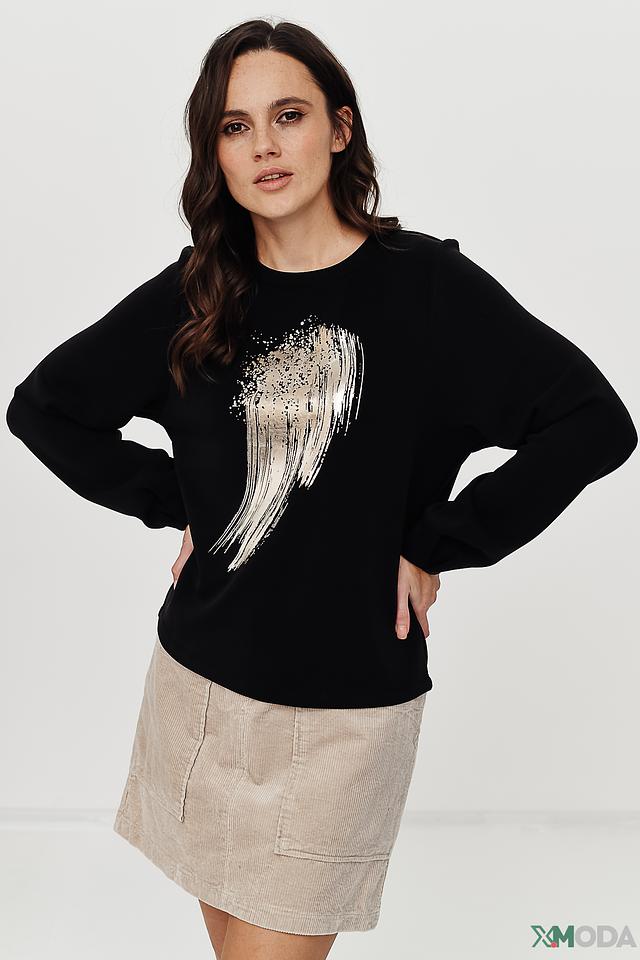 Особый акцент в дизайне пуловера – это эффектный принт в виде крыльев, выполненный в серебристых тонах. Этот декор добавляет образу оригинальности и привлекает внимание. Пуловер изготовлен из высококачественного модала, полиэстера и эластана, что обеспечивает мягкость, комфорт и хорошую посадку по фигуре.