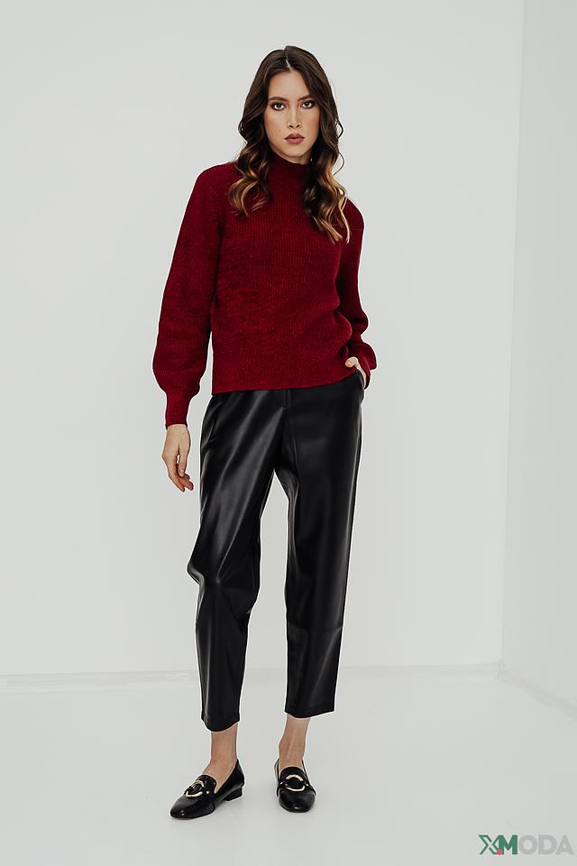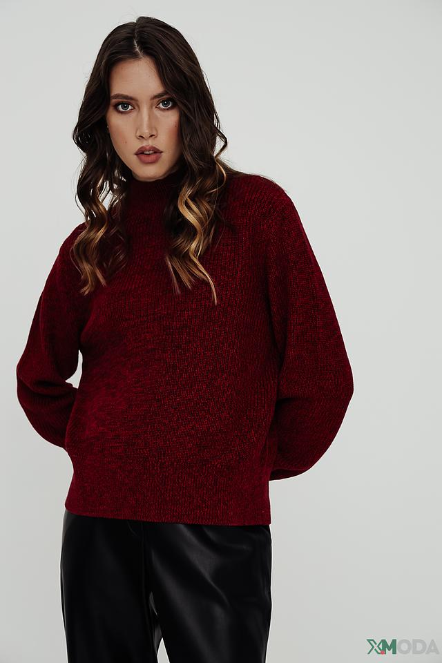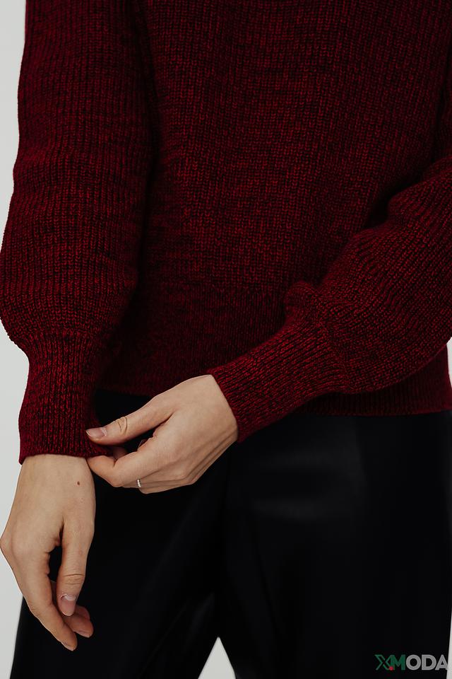 Модель имеет насыщенный винный цвет и свободный крой, который не сковывает движения. Рукава-фонарики добавляют образу романтичности и оригинальности.