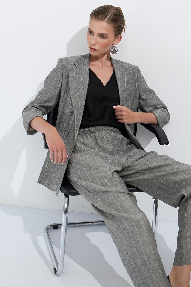 Модель имеет свободный крой, который не сковывает движений, и двубортную застежку на пуговицах. Рукава 3/4 добавляют образу легкости и непринужденности. Жакет украшен классической полоской, которая придает ему изысканность.