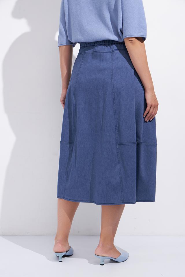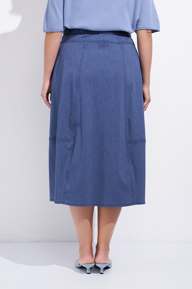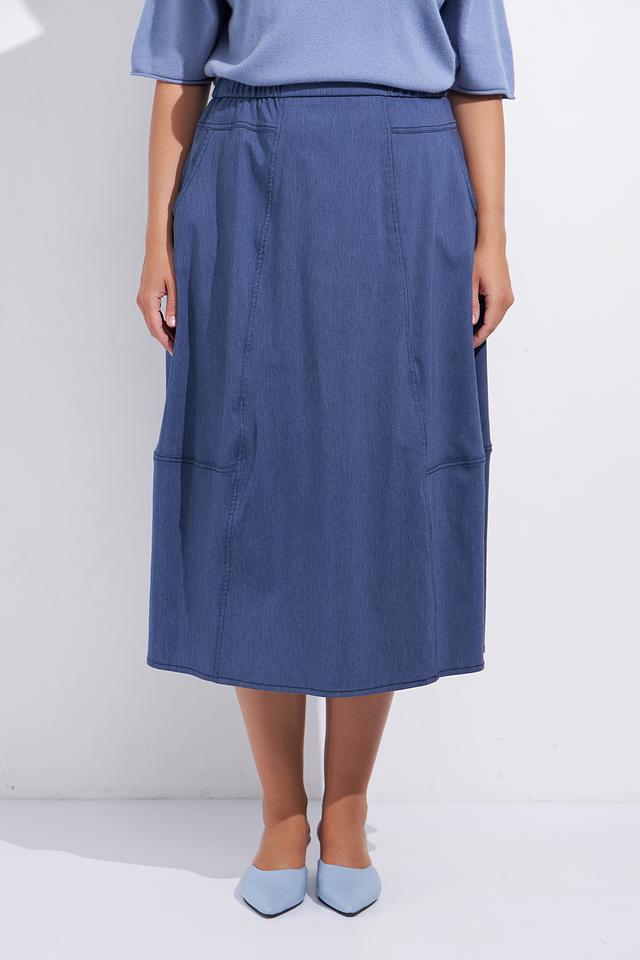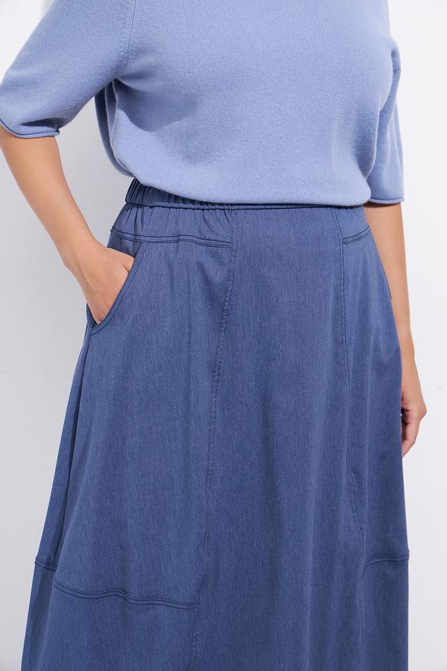 Юбка имеет миди длину и удобную эластичную талию, обеспечивающую комфортную посадку. Наличие функциональных карманов добавляет практичности, а декоративные швы подчеркивают стильный дизайн.