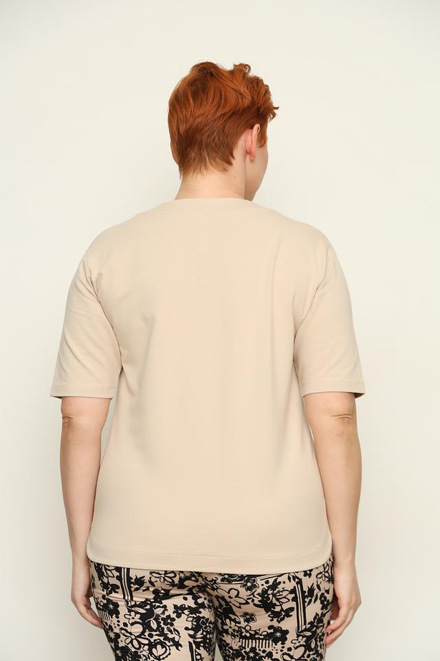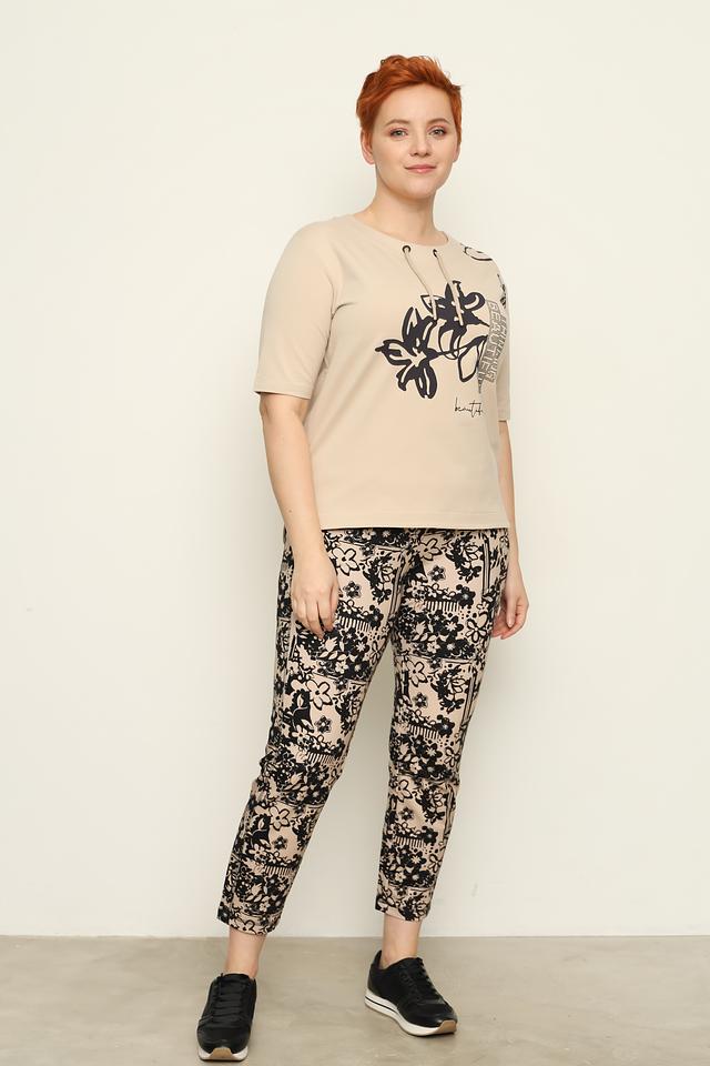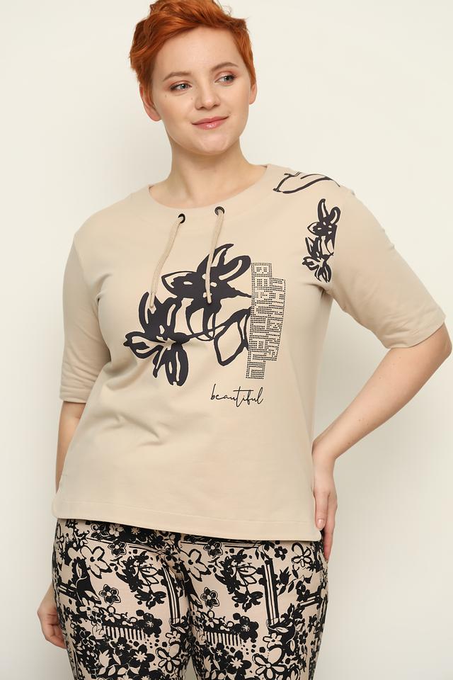 Бежевая футболка от Thomas Rabe с оригинальным цветочным принтом и надписью "beautiful". Модель выполнена из мягкого и приятного к телу сочетания хлопка, вискозы и эластана, обеспечивающего комфорт при носке. Состав: хлопок 60%, вискоза 35%, эластан 5%