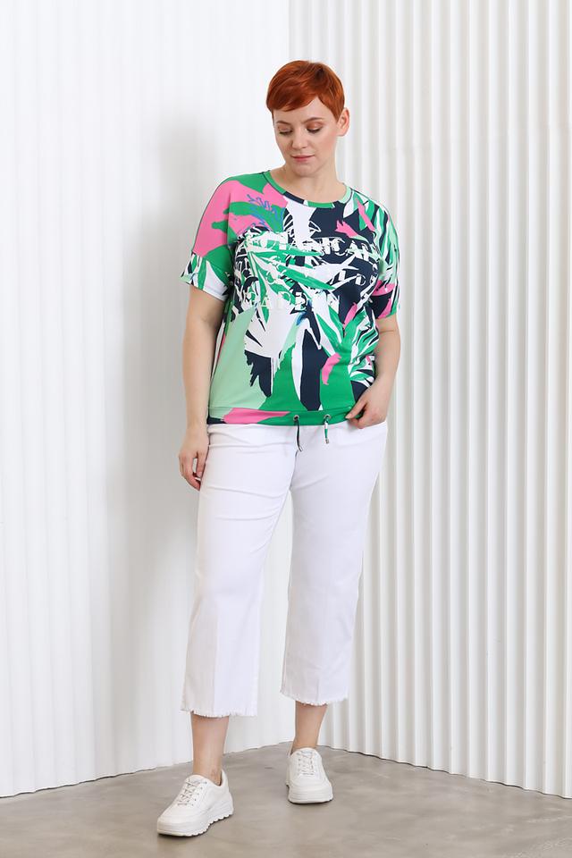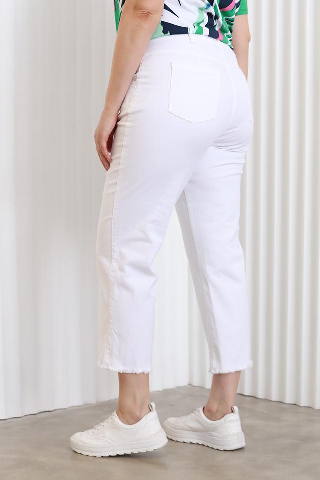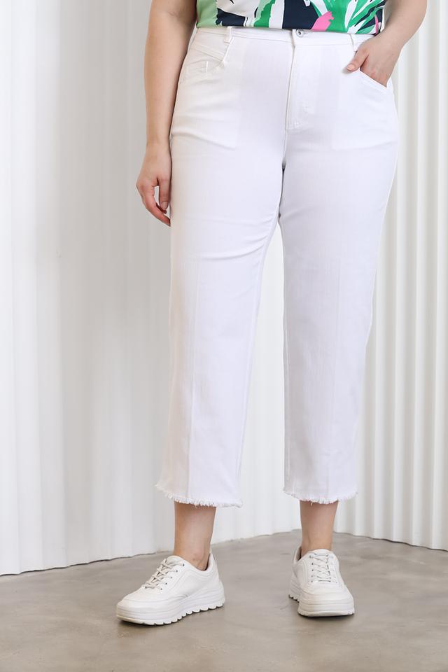 Брюки выполнены из высококачественного хлопка с добавлением эластана (97% хлопок, 3% эластан), что обеспечивает комфорт в носке и хорошую посадку по фигуре. Преобладающий цвет – белый, что делает их универсальными и легко сочетаемыми с различными элементами одежды.