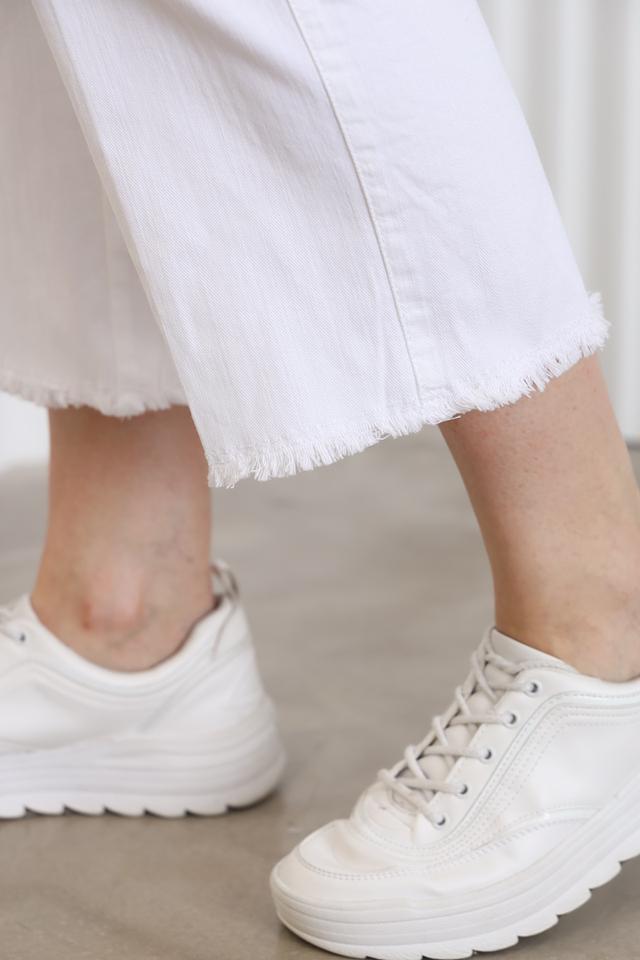 Кюлоты имеют слегка укороченный крой, который подчеркивает изящество ног. Необработанный край придает брюкам непринужденный и современный вид. Удобный пояс с петлями для ремня обеспечивает надежную фиксацию. Брюки оснащены функциональными карманами.