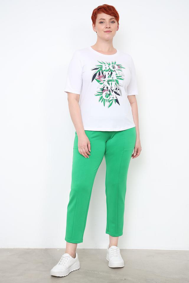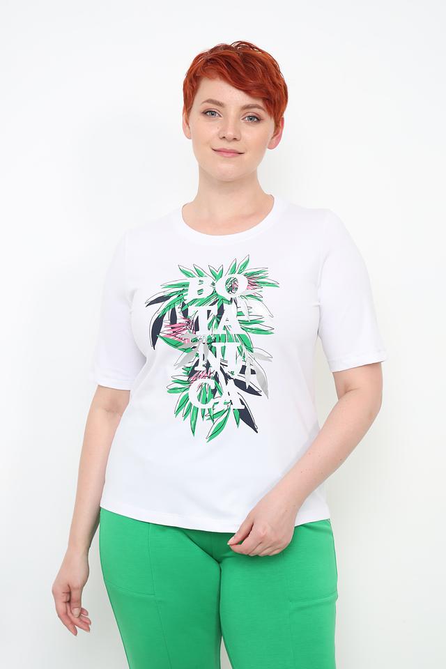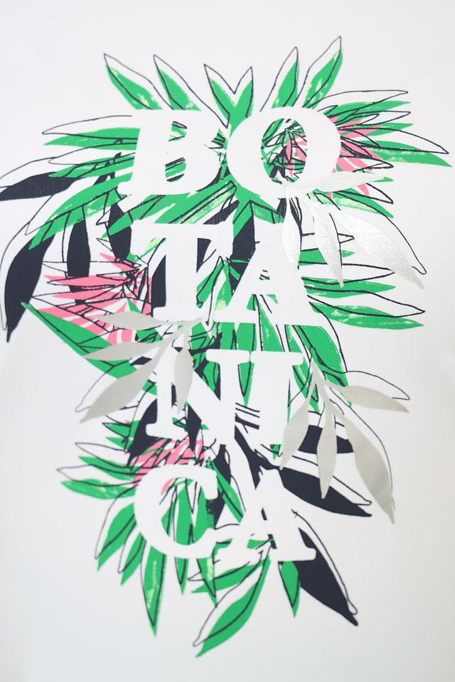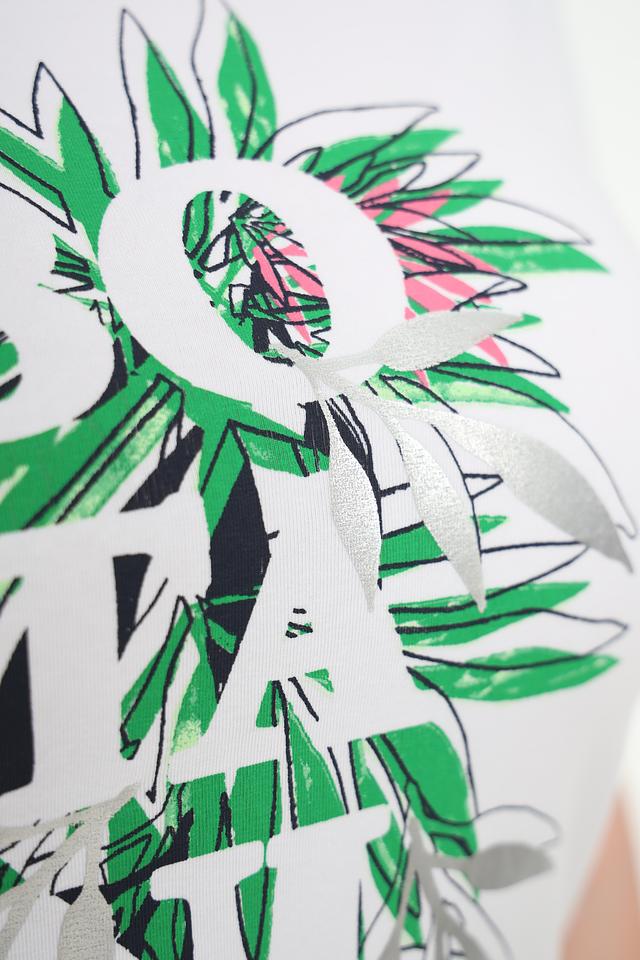 Особенностью данной модели является яркий и оригинальный принт с изображением тропических листьев и надписью. Принт выполнен в зеленых, розовых и черных тонах, что придает футболке свежий и современный вид.