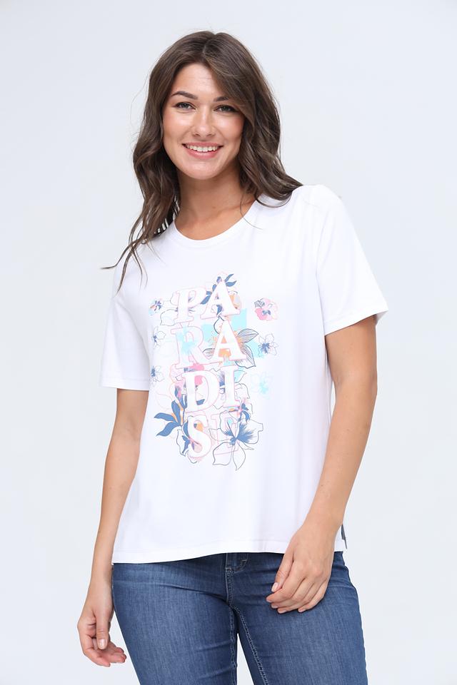 Особенностью данной модели является яркий и красочный принт с изображением цветов и надписью "PARADISE". Футболка имеет классический прямой крой и круглый вырез горловины.