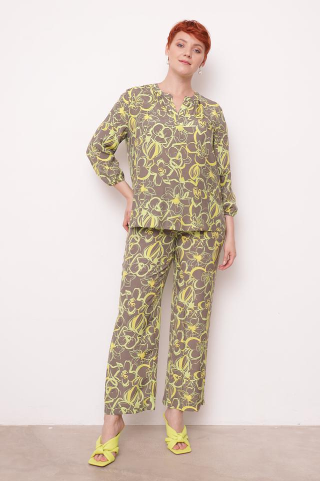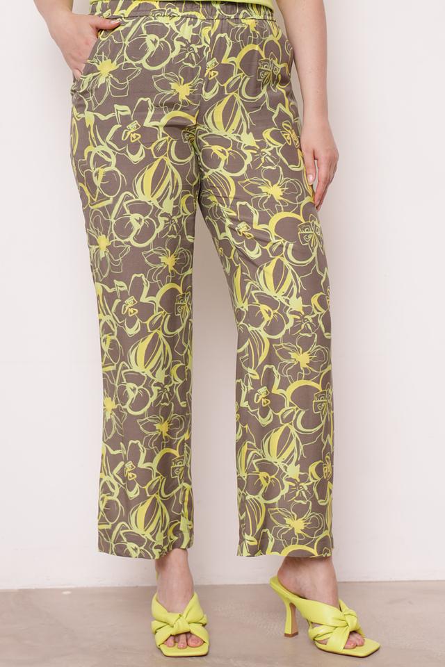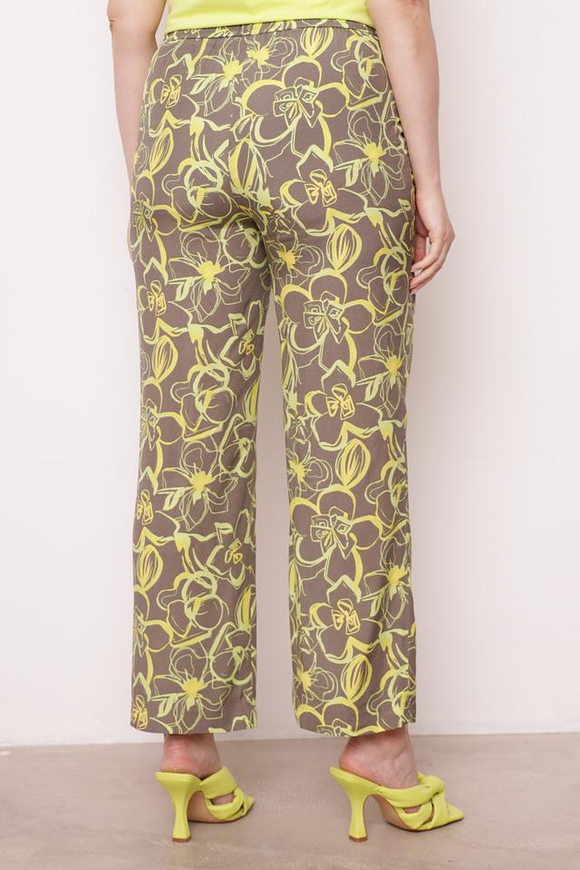 Основной цвет брюк – коричневый, но главным акцентом является яркий цветочный принт, выполненный в оттенках зелёного и жёлтого. Этот принт добавляет образу свежести и оригинальности.