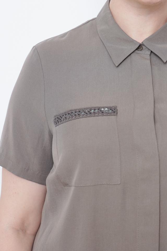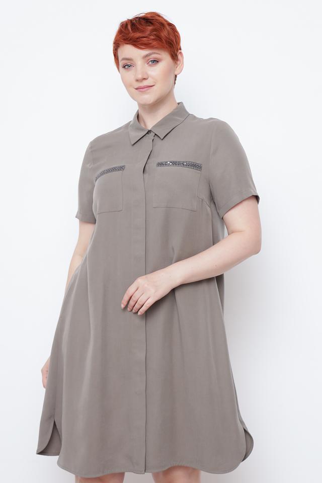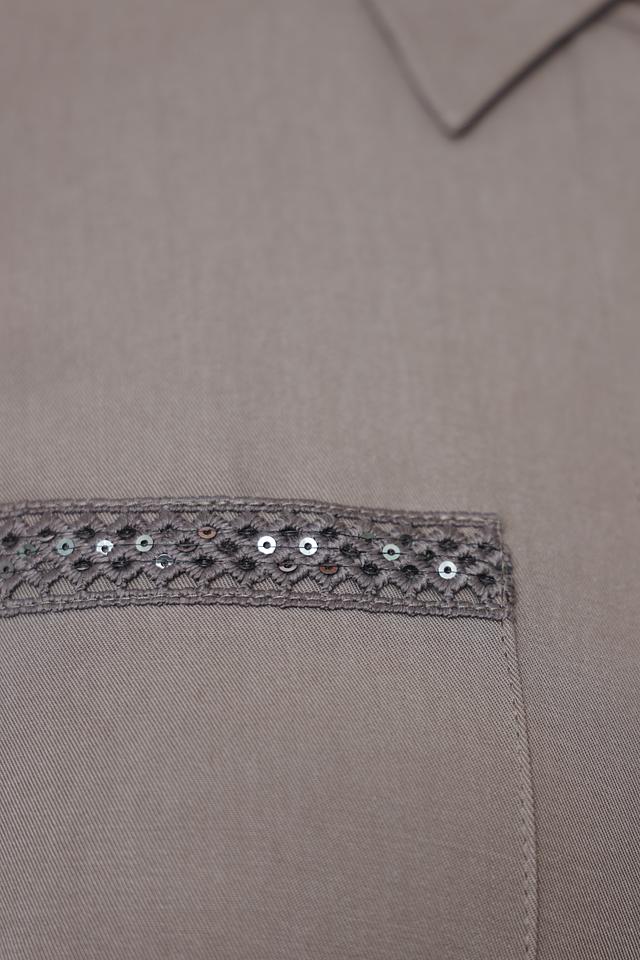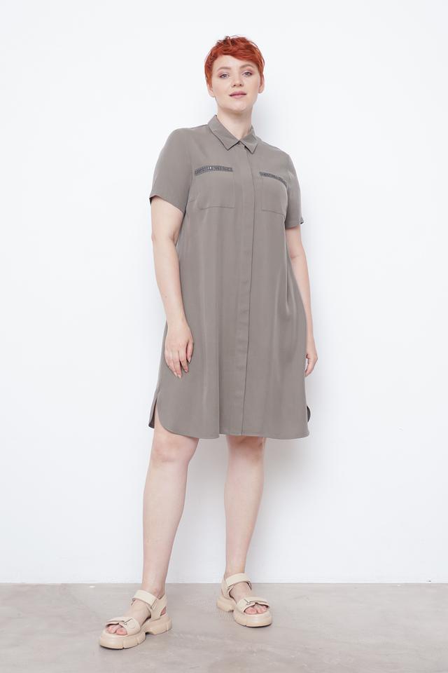 Платье имеет прямой силуэт, короткие рукава и классический воротник. Застёжка на пуговицах по всей длине позволяет регулировать степень прилегания. На груди расположены накладные карманы, декорированные отделкой с блестками, что придает образу изысканность.