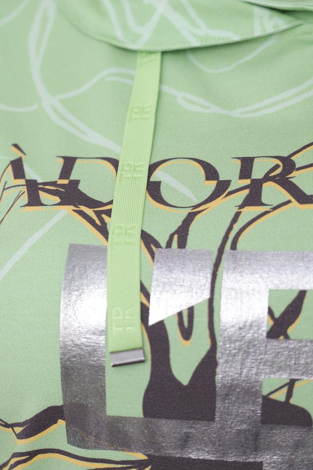Модель имеет удобный крой, короткие рукава и небольшой воротник-стойка с капюшоном на завязках. Футболка изготовлена из высококачественного материала, сочетающего в себе 48% хлопка, 48% модала и 4% эластана. Такое сочетание обеспечивает мягкость, комфорт и хорошую посадку по фигуре.