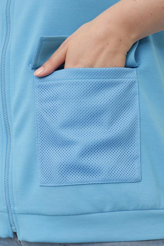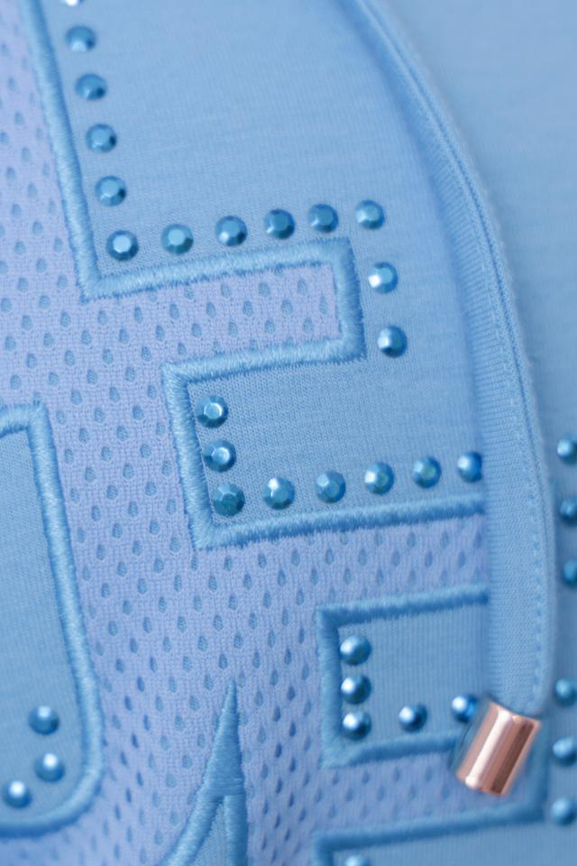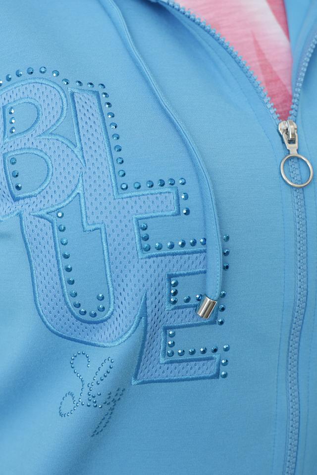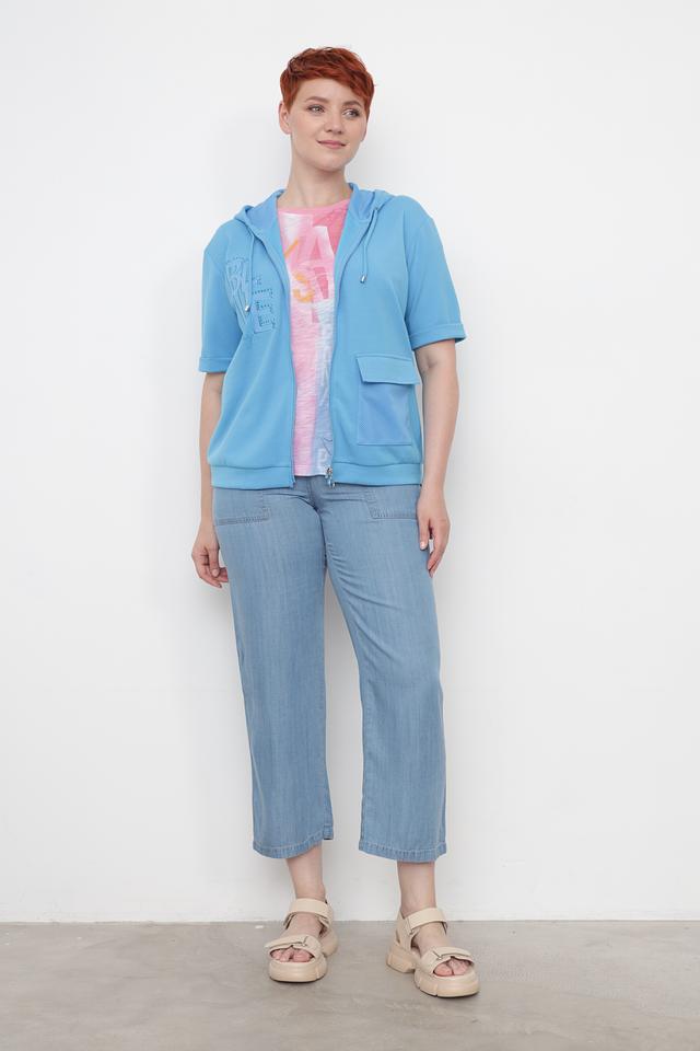 Женская толстовка Thomas Rabe голубого цвета с коротким рукавом и застежкой-молнией. Модель украшена принтом и имеет удобный капюшон, а также функциональные карманы. Состав: полиэстер 50%, вискоза 44%, эластан 6%