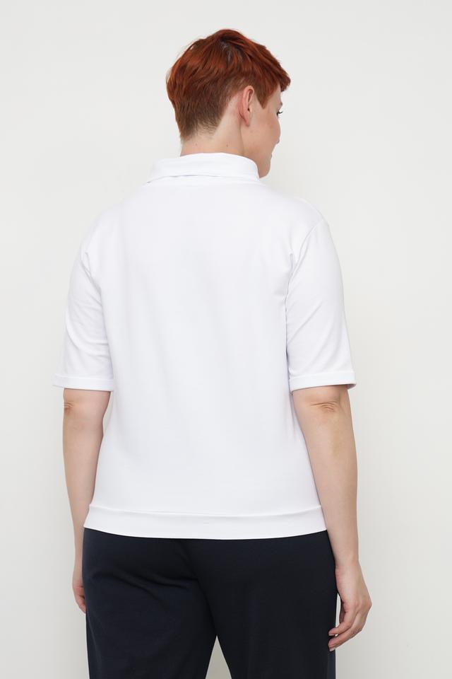 Модель имеет прямой крой, короткий рукав и удобный воротник-стойка. Футболка изготовлена из высококачественного трикотажа, состоящего из 47% хлопка, 47% модала и 6% эластана. Такое сочетание материалов обеспечивает мягкость, комфорт и хорошую посадку по фигуре.