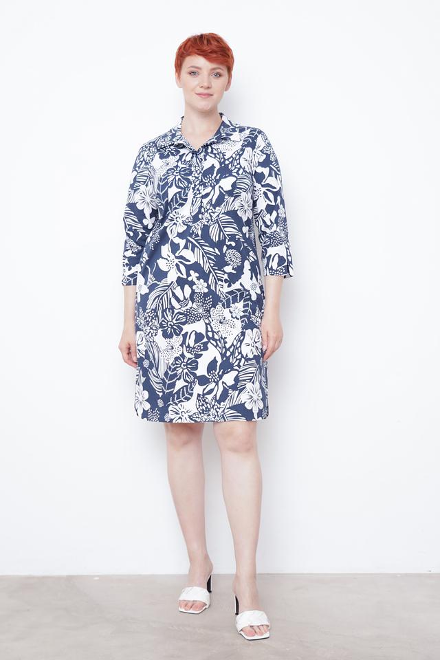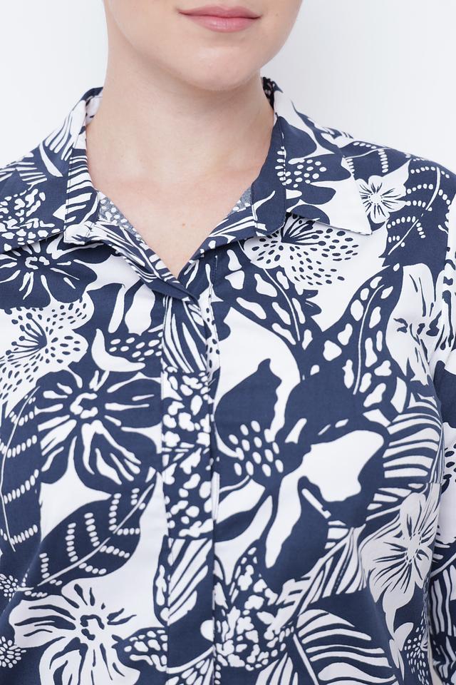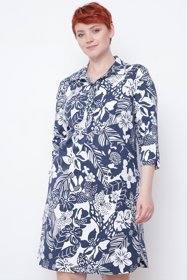 Основной цвет платья – насыщенный синий, а главным акцентом является яркий цветочный принт, который покрывает всю поверхность изделия. Принт выполнен в белоснежном цвете, что создает контрастный и привлекательный вид. Состав ткани: 96% хлопок, 4% эластан.