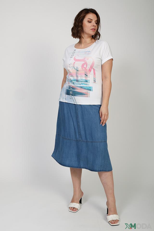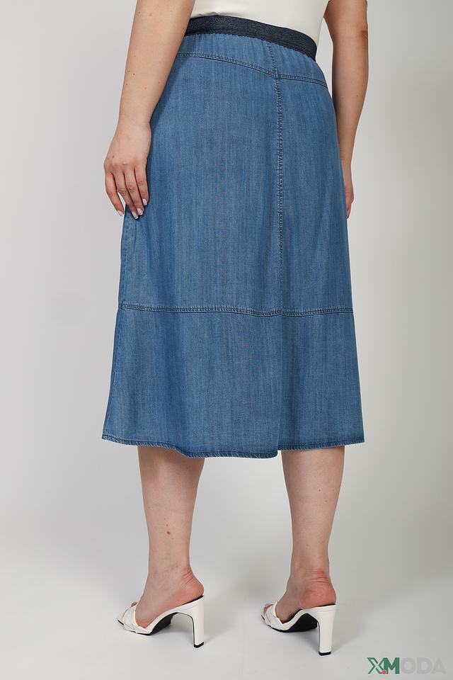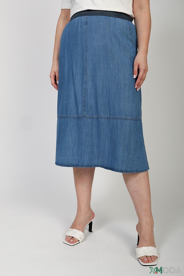 Эластичный пояс обеспечивает комфортную посадку по фигуре, а боковые карманы добавляют практичности. Юбка имеет светло-голубой цвет, имитирующий деним, что придает ей непринужденный и стильный вид. Эта юбка станет отличным выбором для создания повседневных образов, сочетаясь с различными топами, футболками и обувью.
